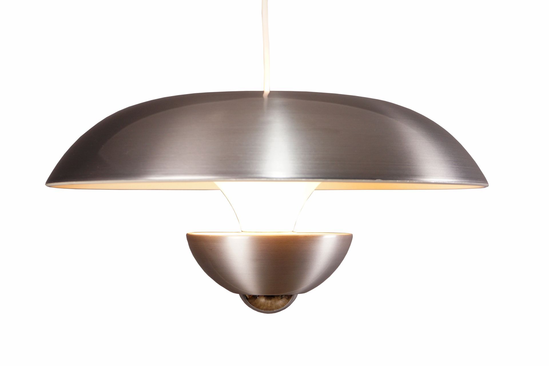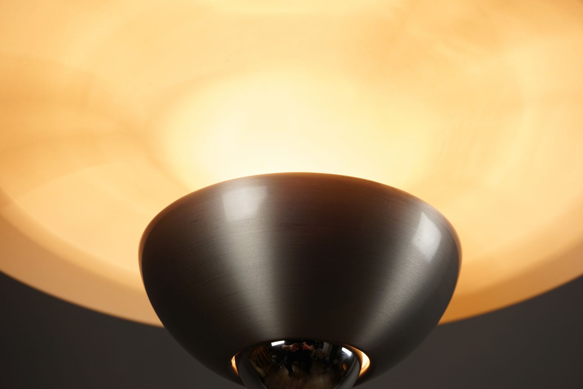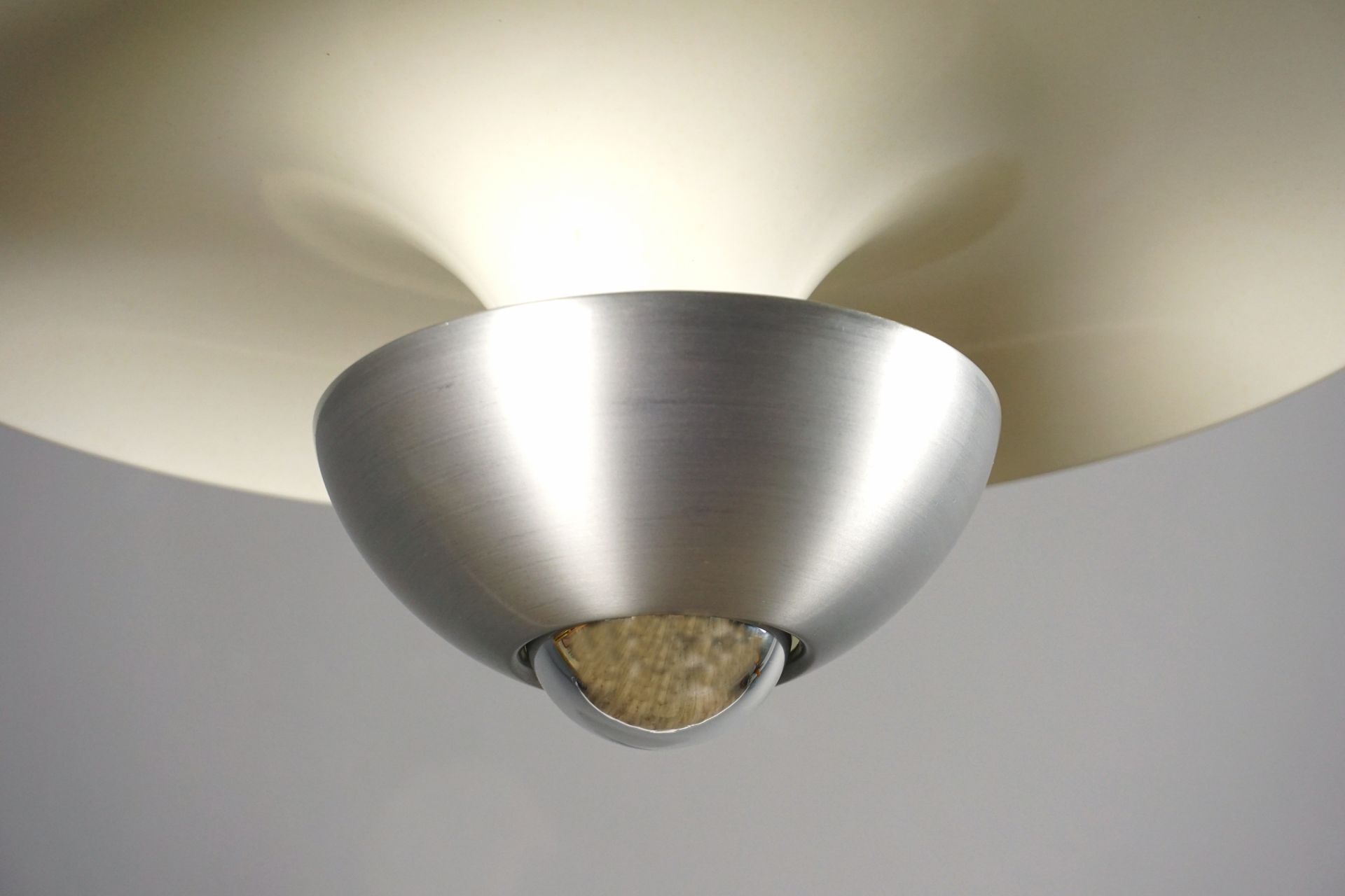 Um den Raum auch oberhalb der Lampe zu beleuchten, besitzt dieser Designklassiker , optisch versteckt, zwei vertieft liegende Fassungen im Oberschirm. Diese können nach Gefallen mit 2 Kerzenbirnen, Kühlschrankbirnen etc optisch unsichtbar bei seitlicher Betrachtung verbaut werden.