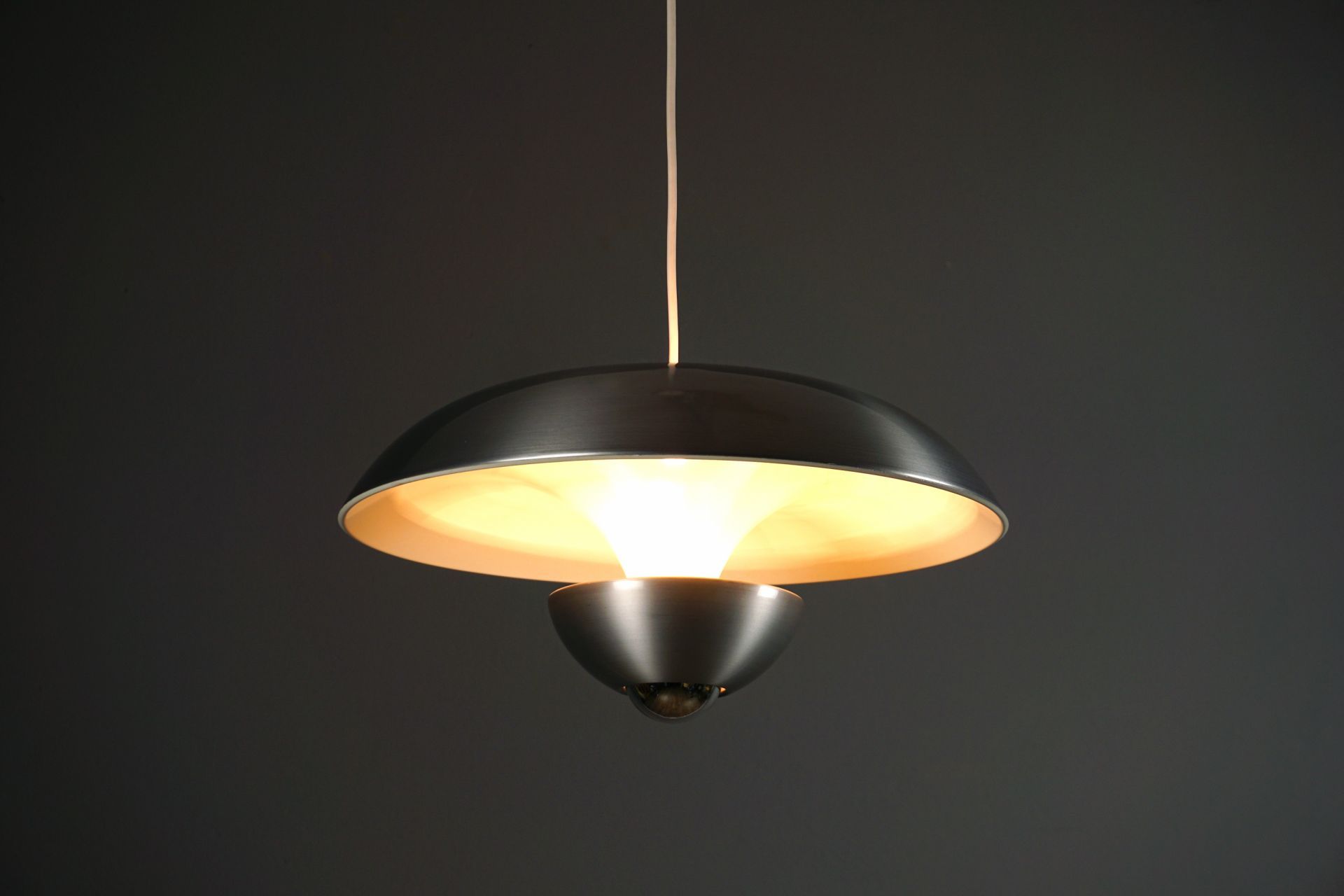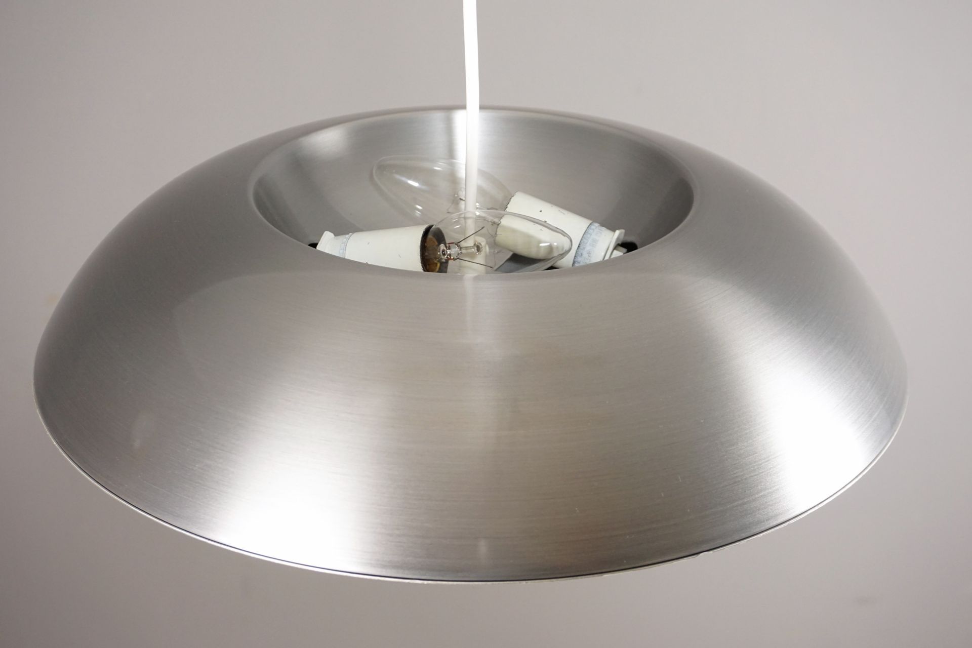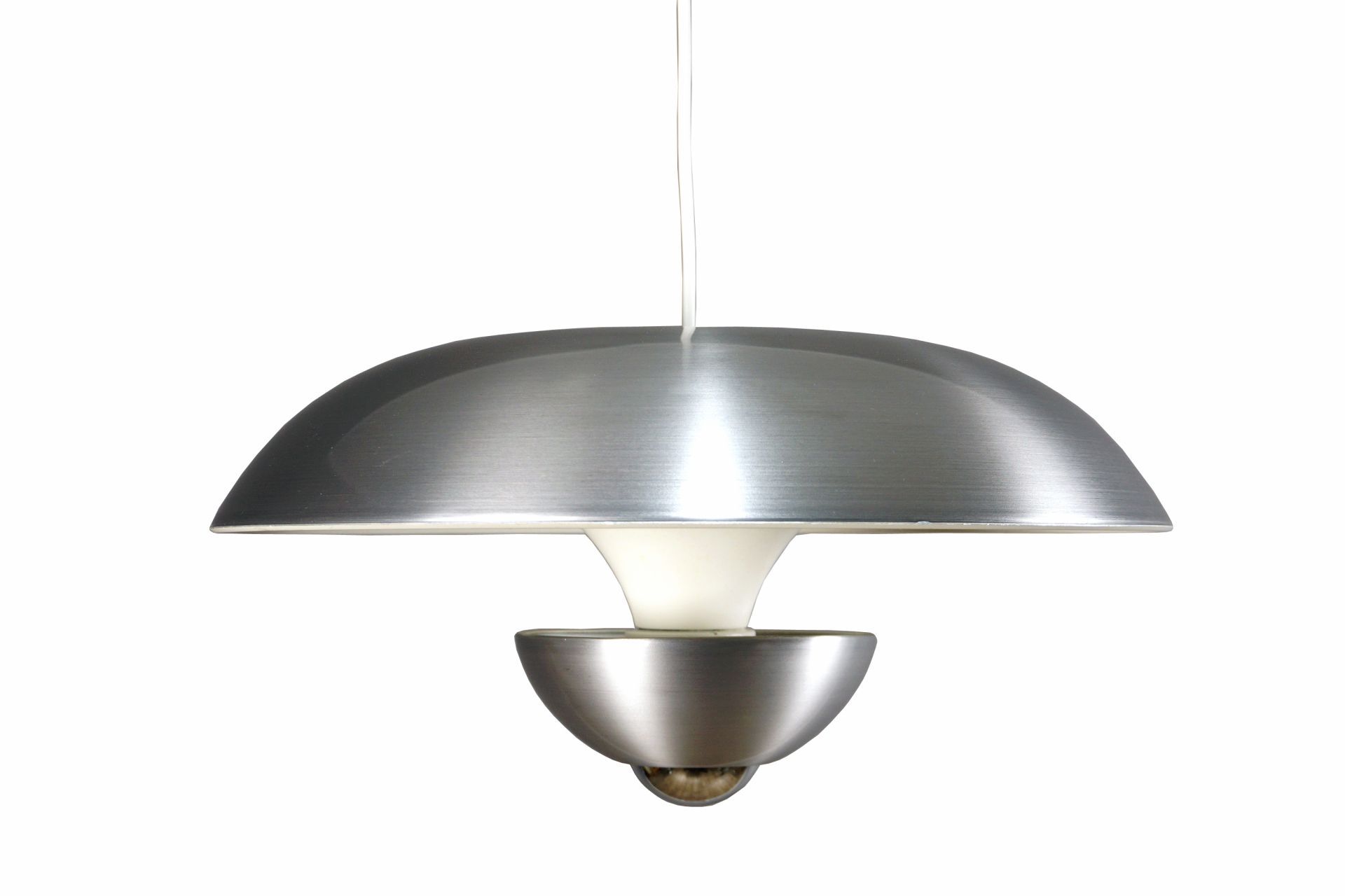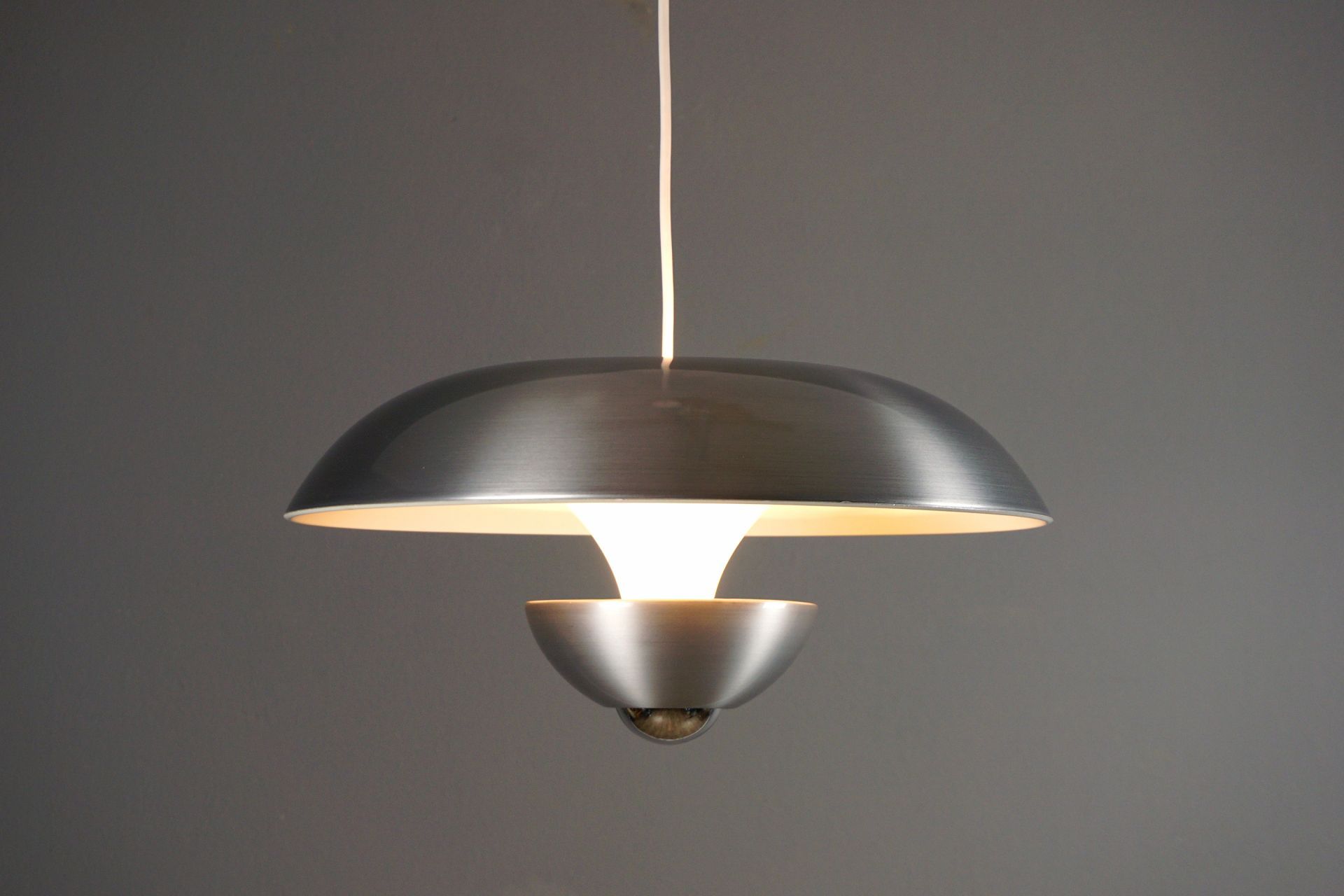 Um den Raum auch oberhalb der Lampe zu beleuchten, besitzt dieser Designklassiker , optisch versteckt, zwei vertieft liegende Fassungen im Oberschirm. Diese können nach Gefallen mit 2 Kerzenbirnen, Kühlschrankbirnen etc optisch unsichtbar bei seitlicher Betrachtung verbaut werden.