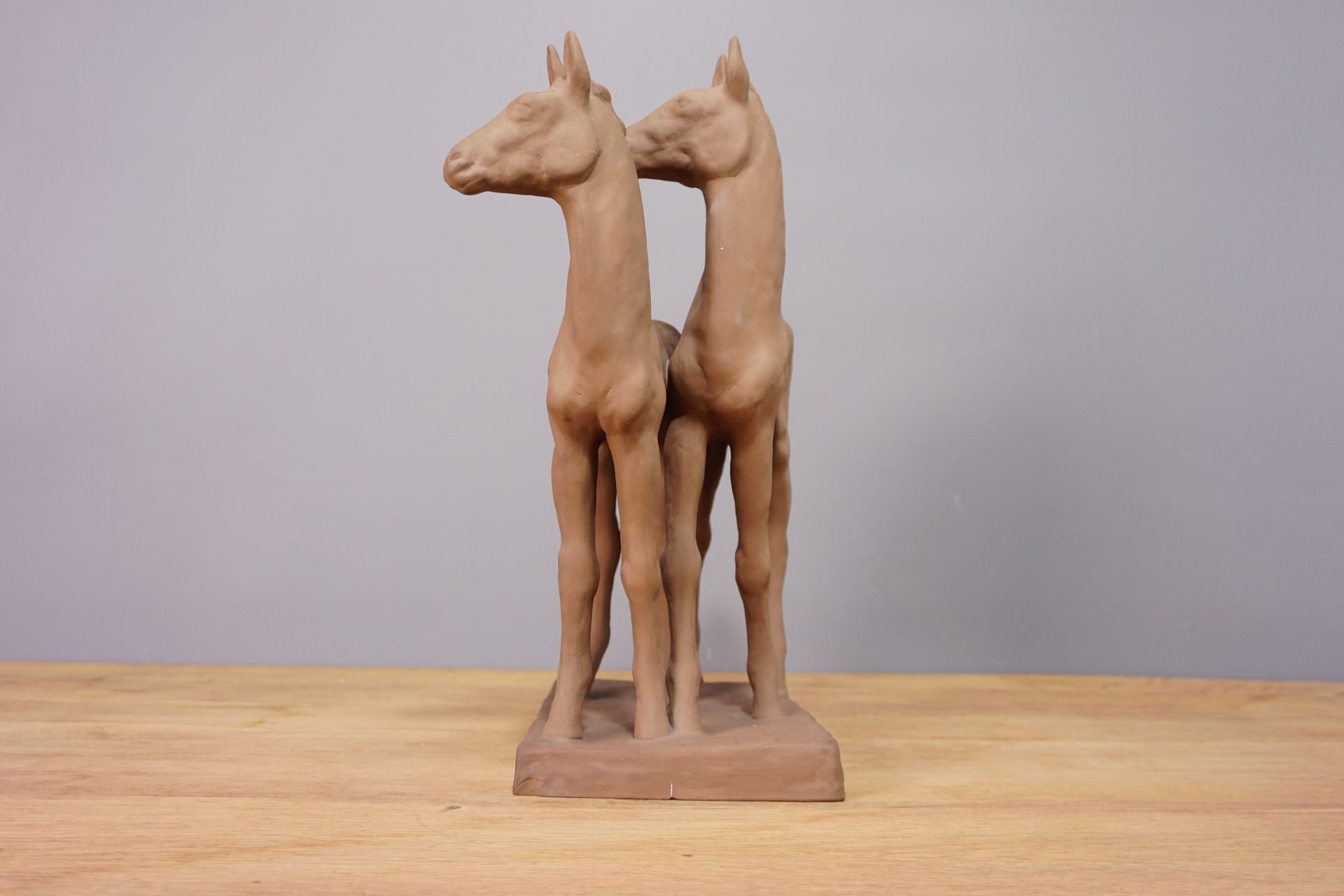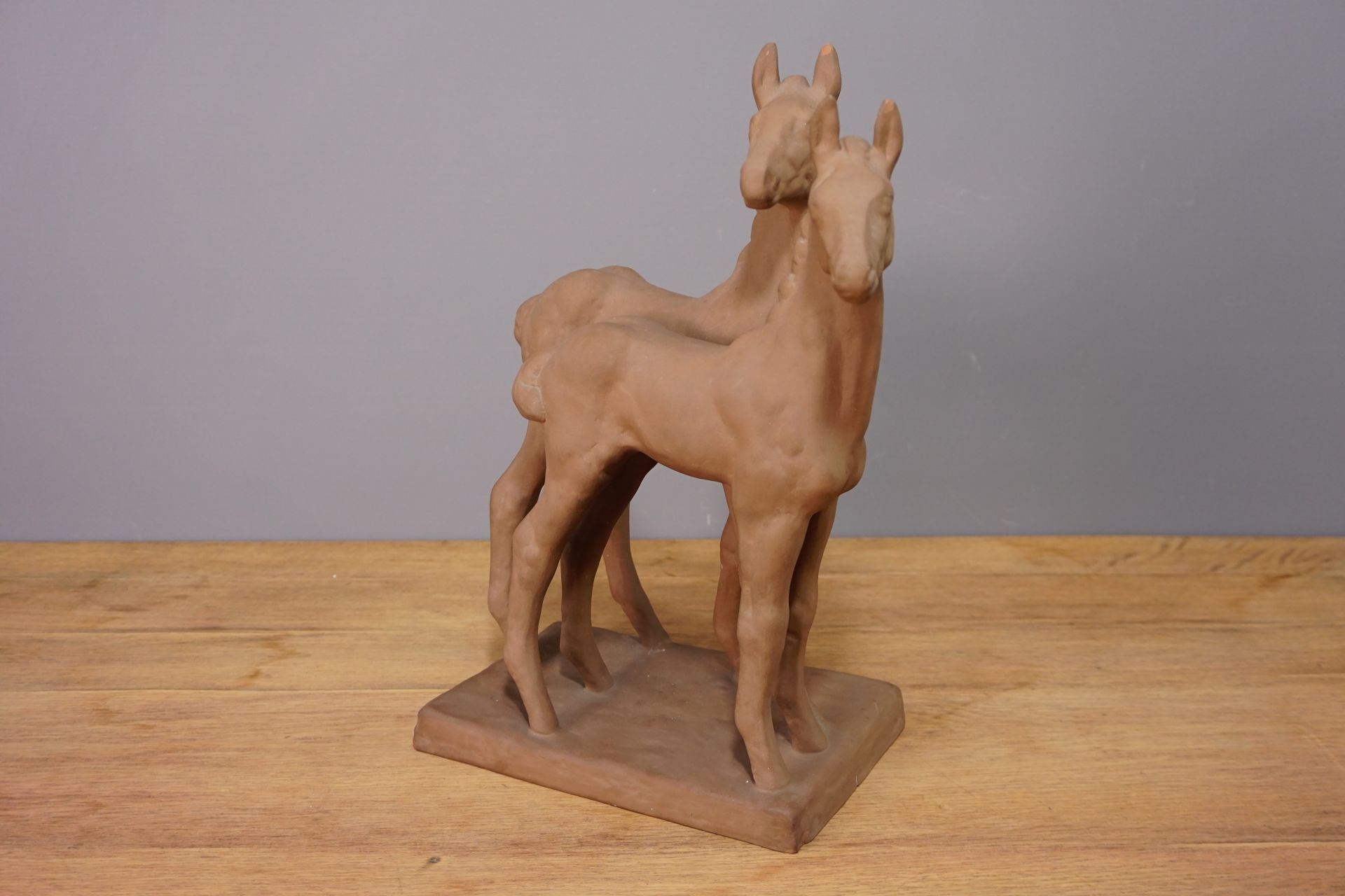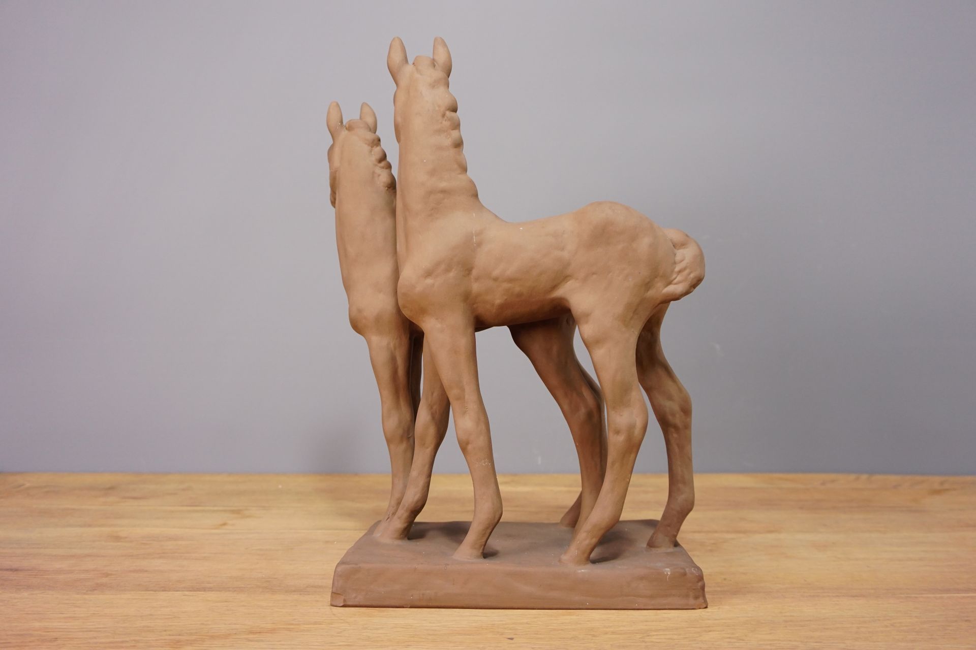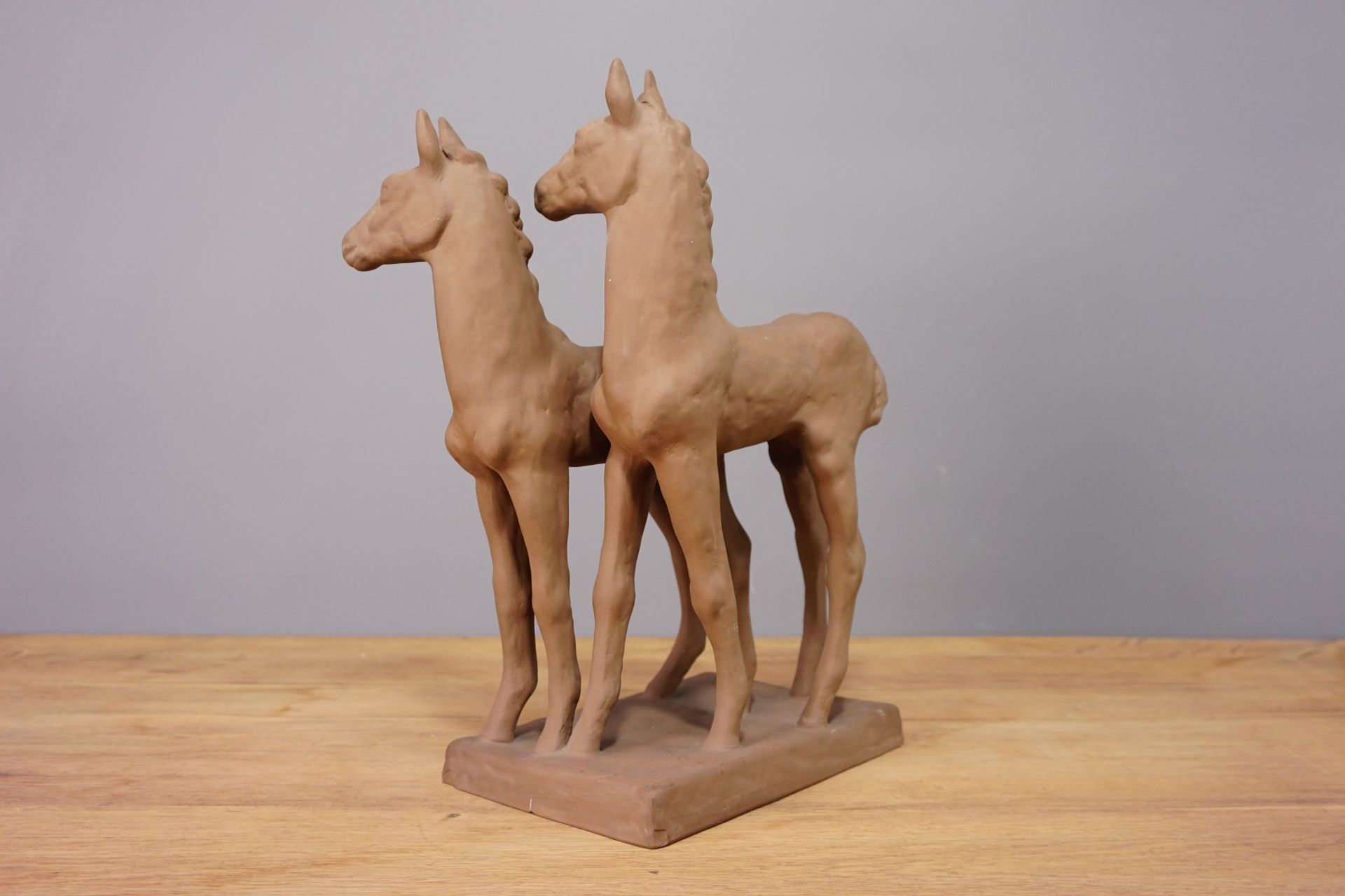 Die Pferde stehen leicht versetzt nebeneinander auf einer rechteckigen Plinte mit wacher neugieriger Haltung und gehobenem Kopf. Sehr plastische und naturgetreue Formgebung.