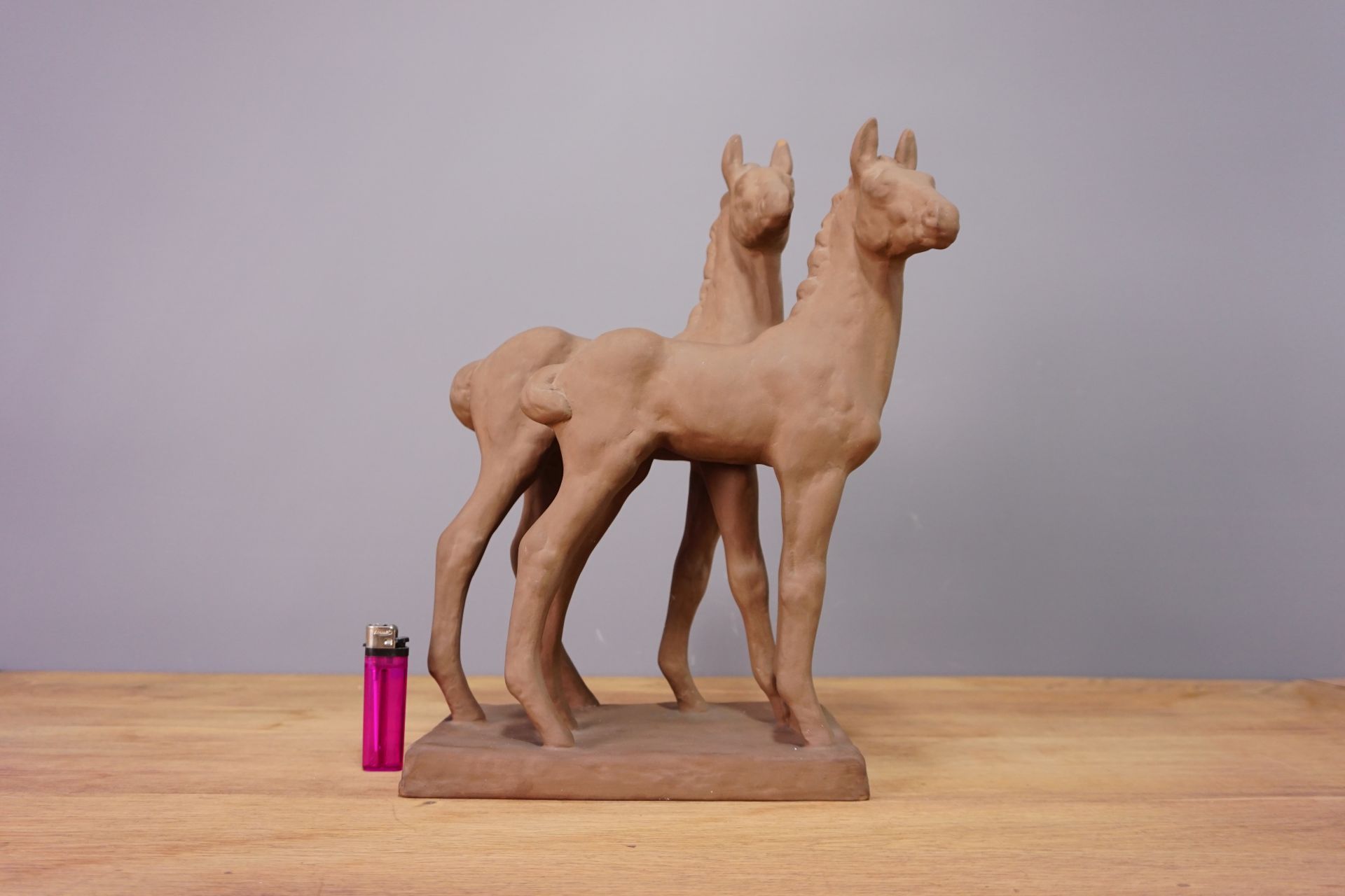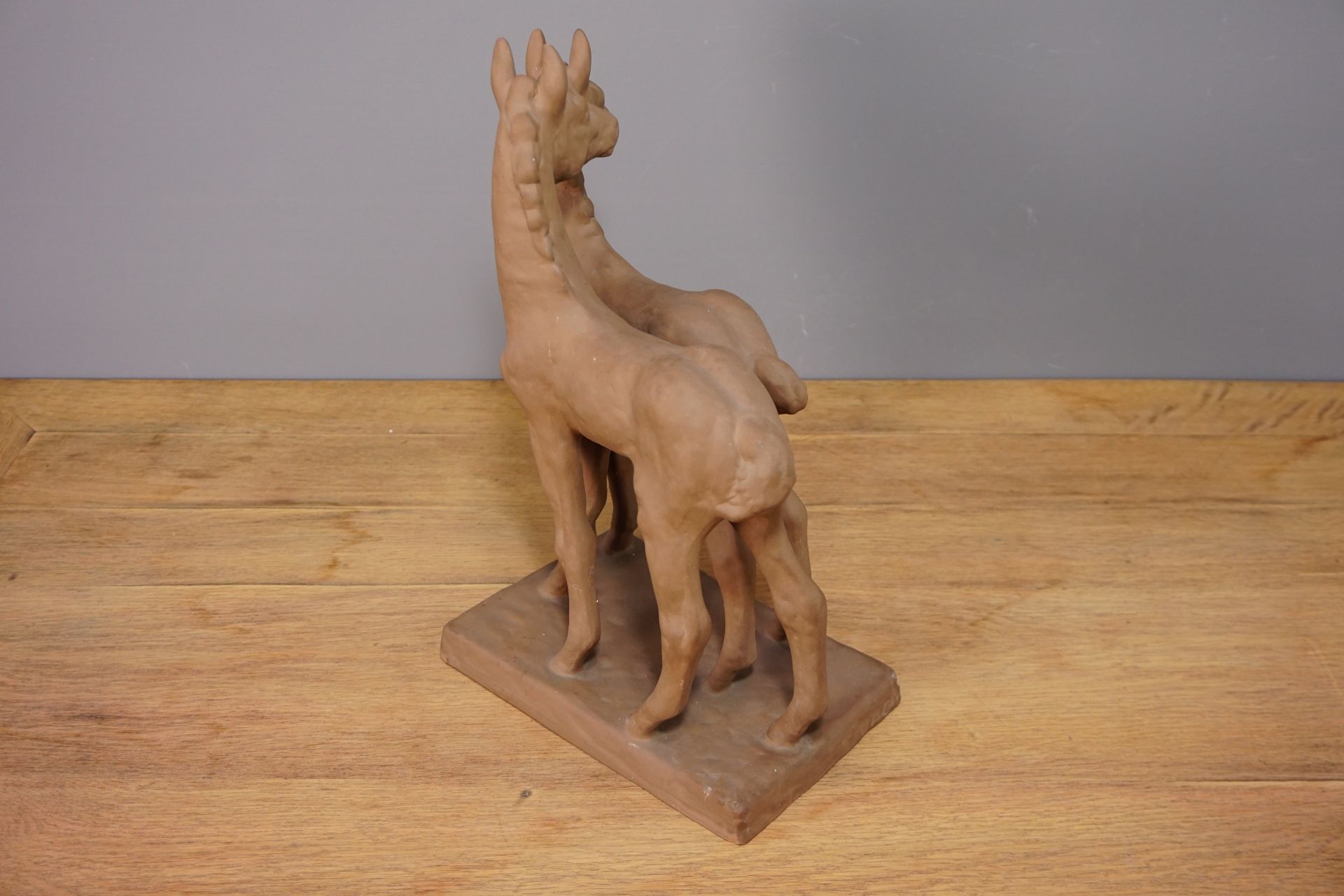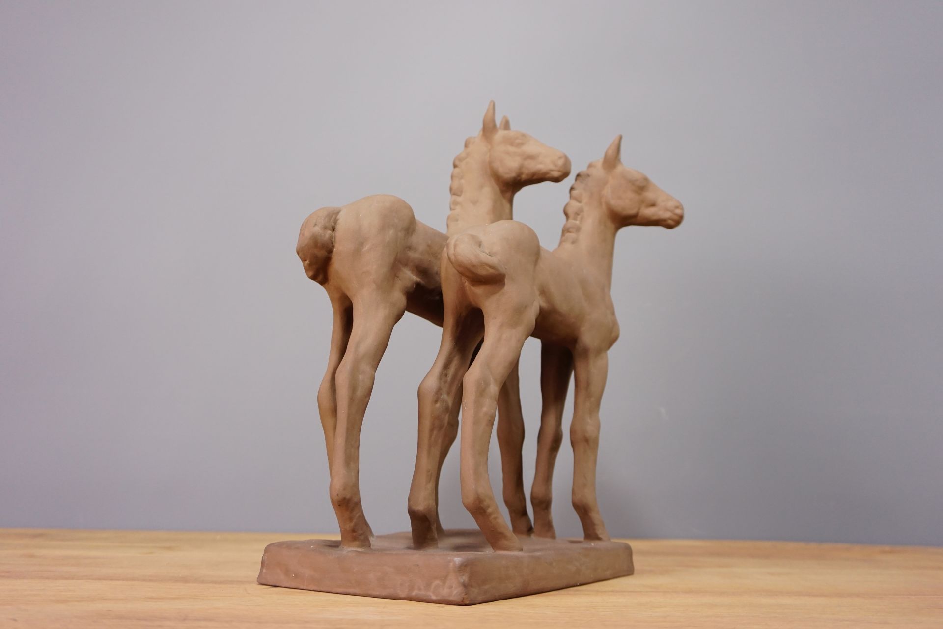 Die Pferde stehen leicht versetzt nebeneinander auf einer rechteckigen Plinte mit wacher neugieriger Haltung und gehobenem Kopf. Sehr plastische und naturgetreue Formgebung.