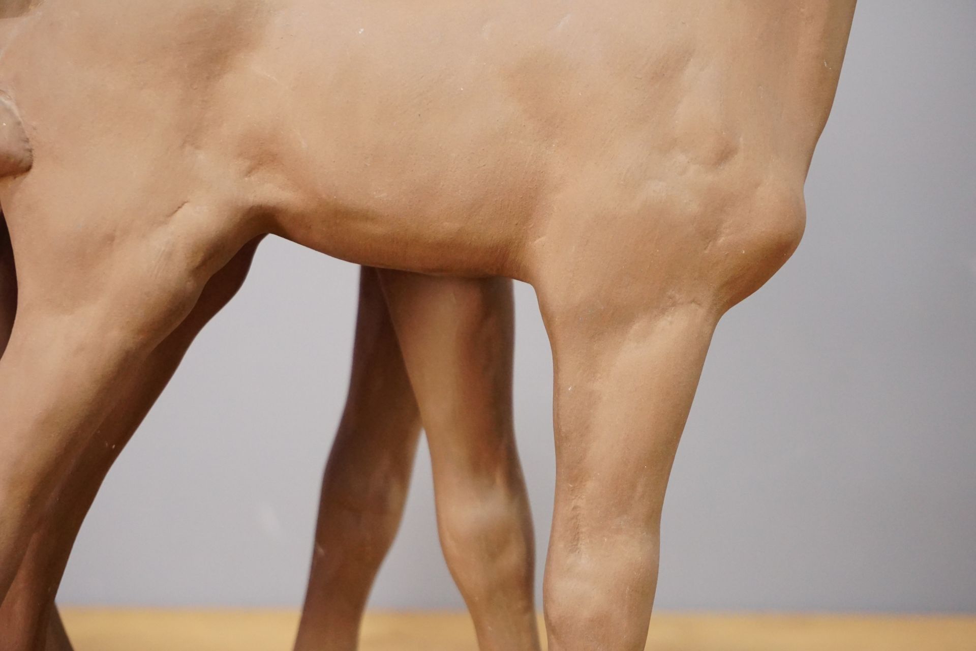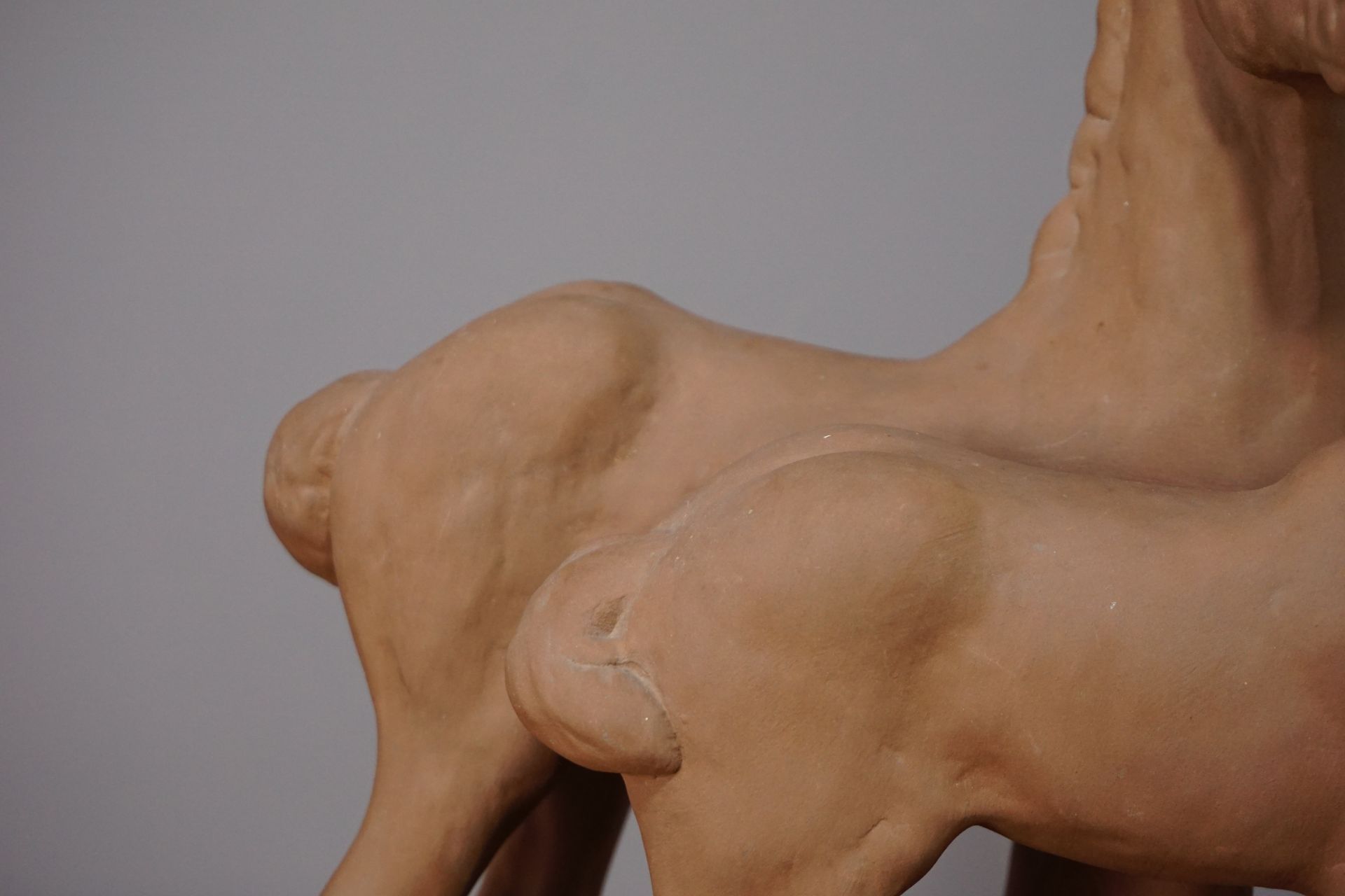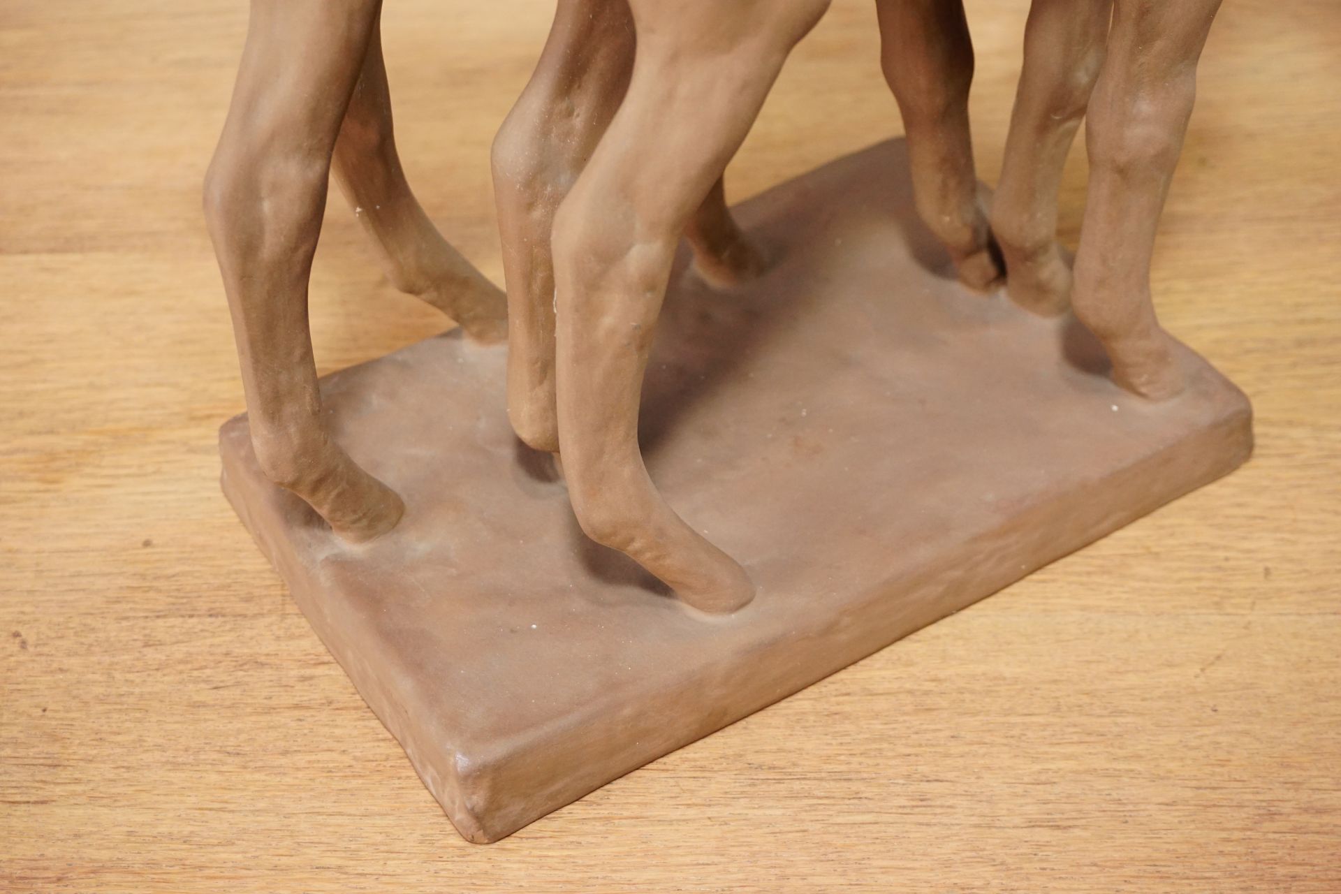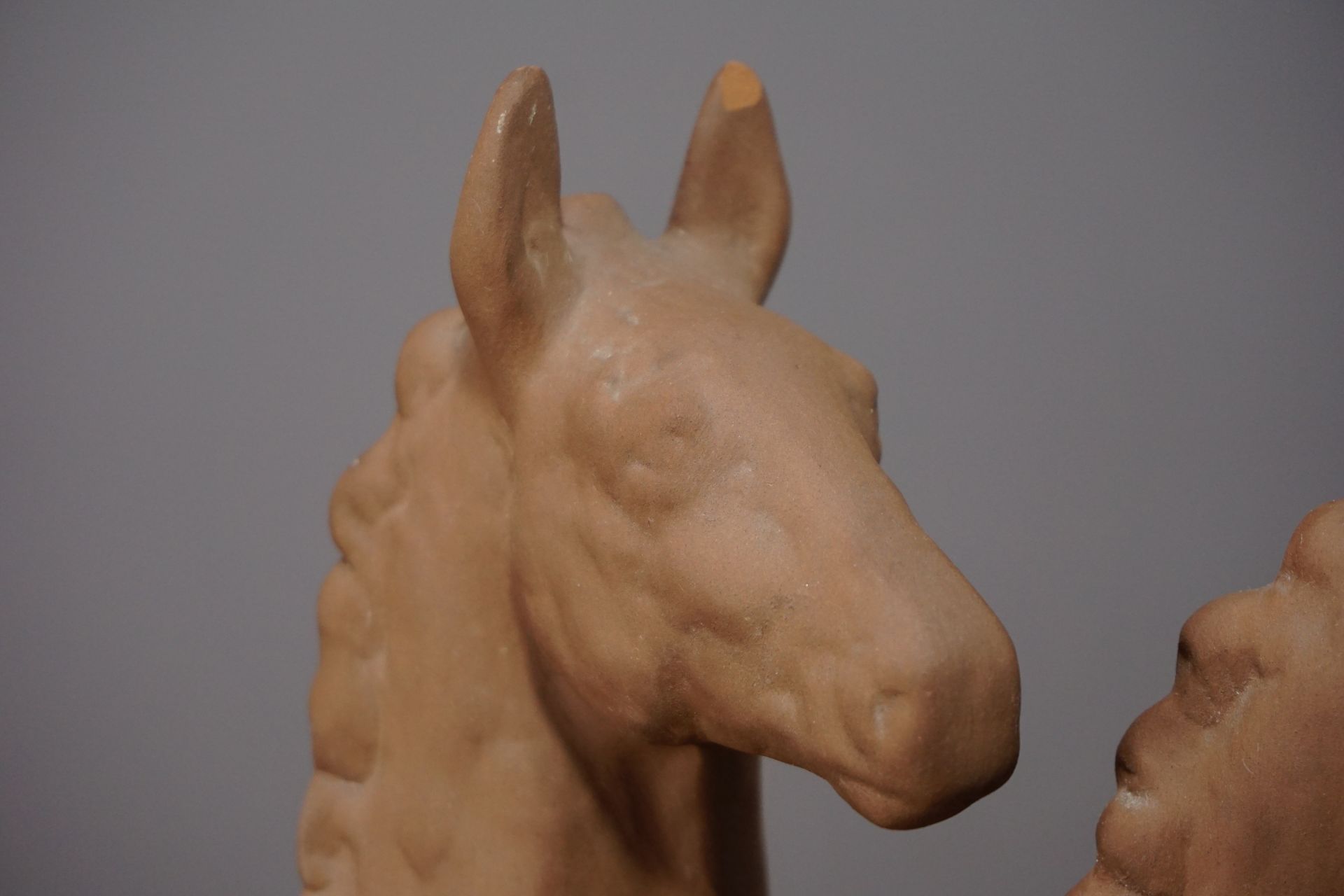 Die Pferde stehen leicht versetzt nebeneinander auf einer rechteckigen Plinte mit wacher neugieriger Haltung und gehobenem Kopf. Sehr plastische und naturgetreue Formgebung.