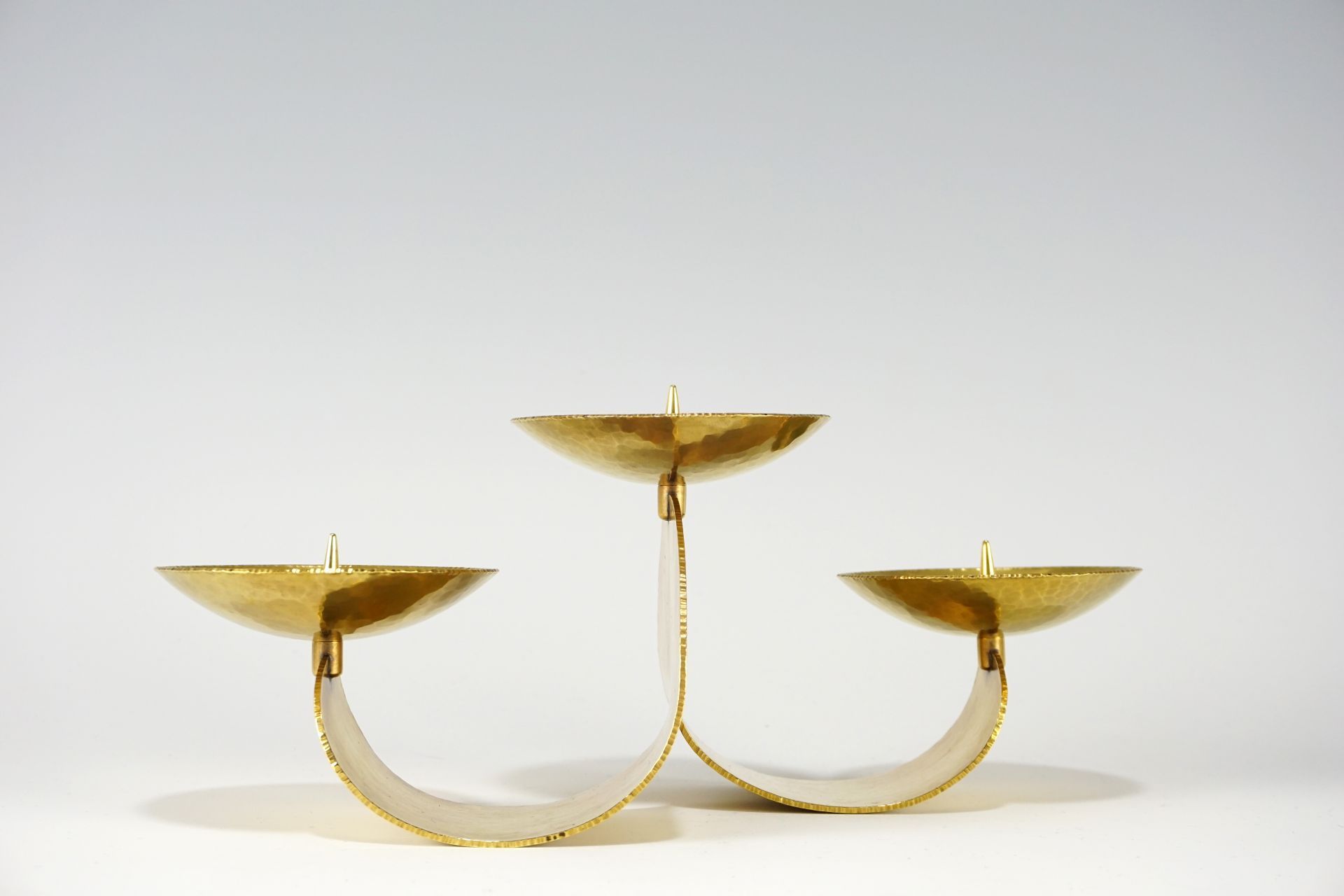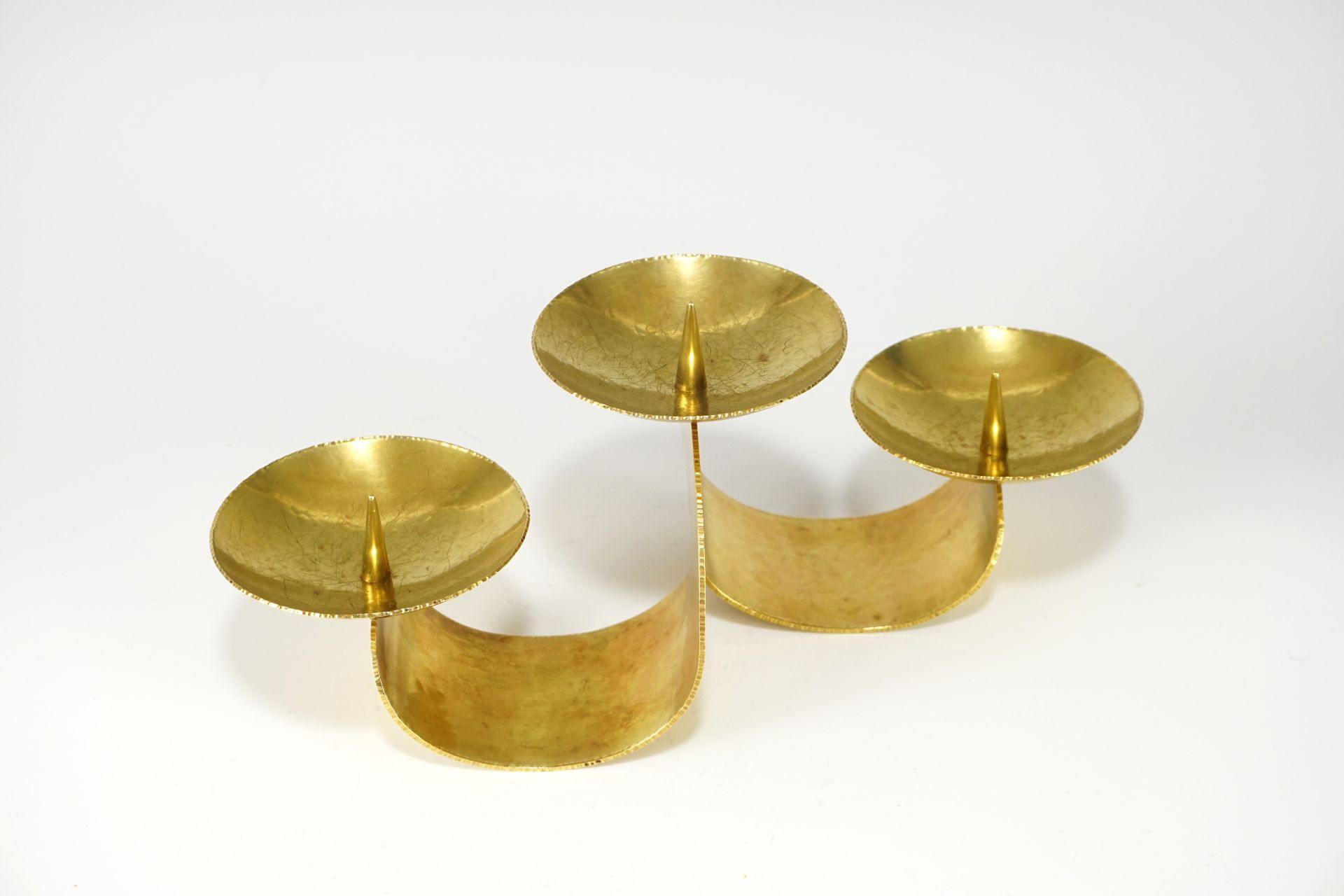 Wie eine gehende Figur, bei der ein Fuß nach vorne, und der andere nach hinten geht, teilt sich das Messingblech in 3 Ebenen auf, wovon jede eine Kerze aufnimmt. Die Tropfschalen mit Dorn nehmen die Rundungen wunderbar wieder auf.