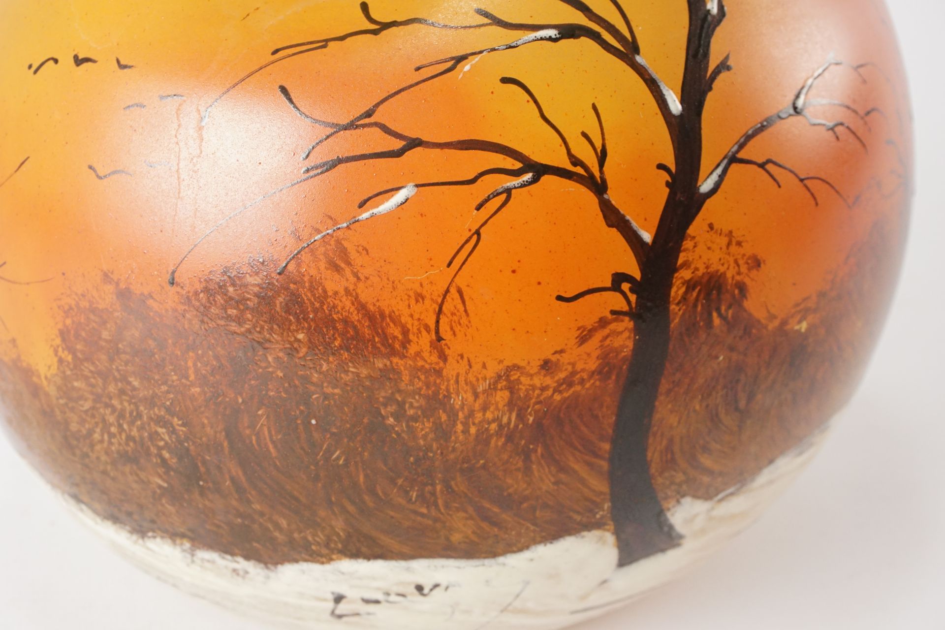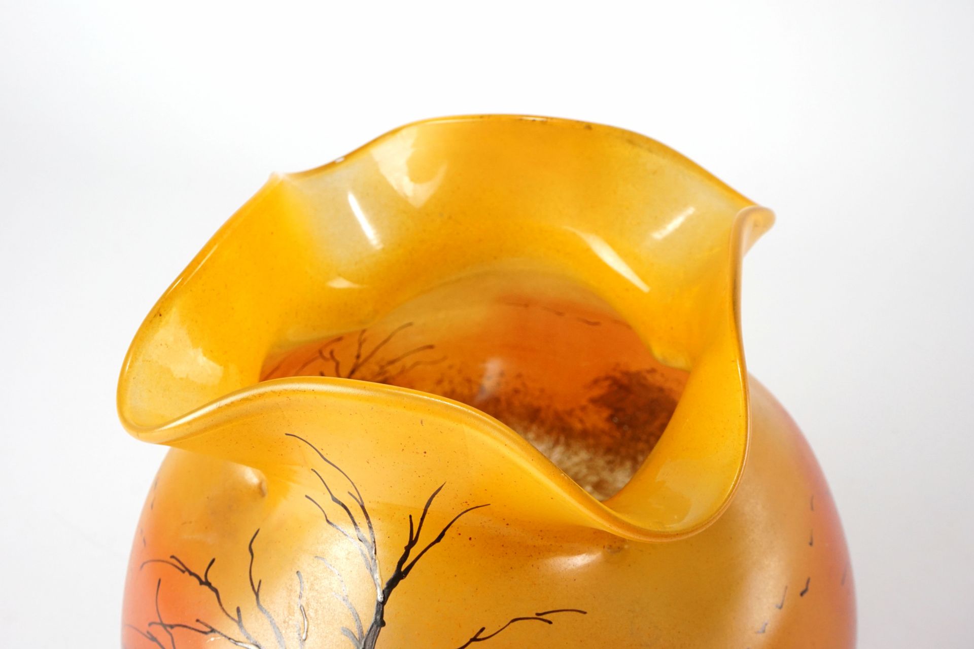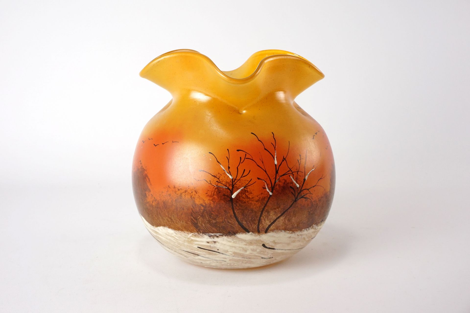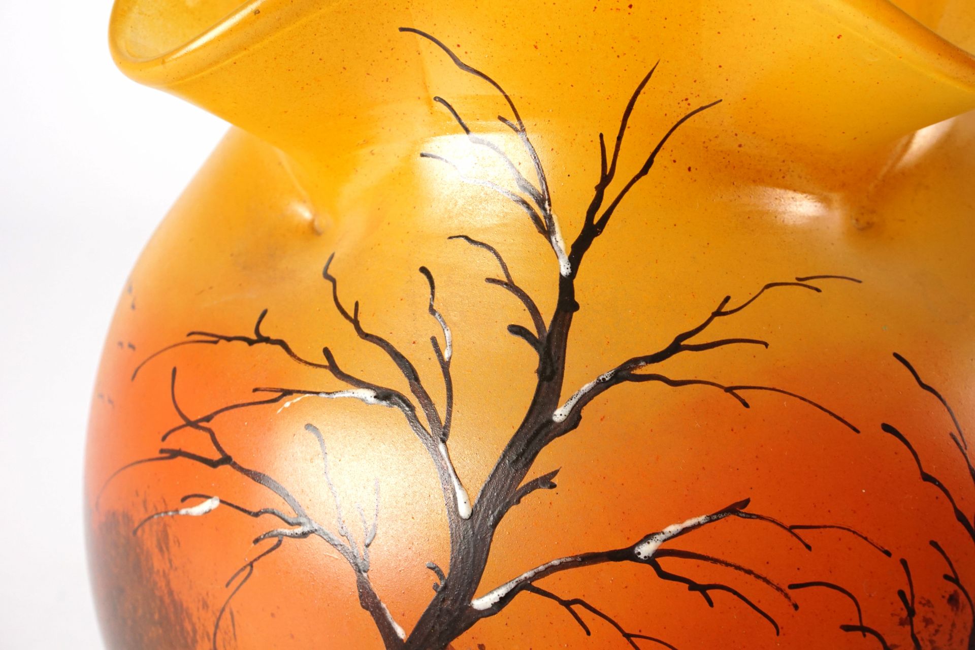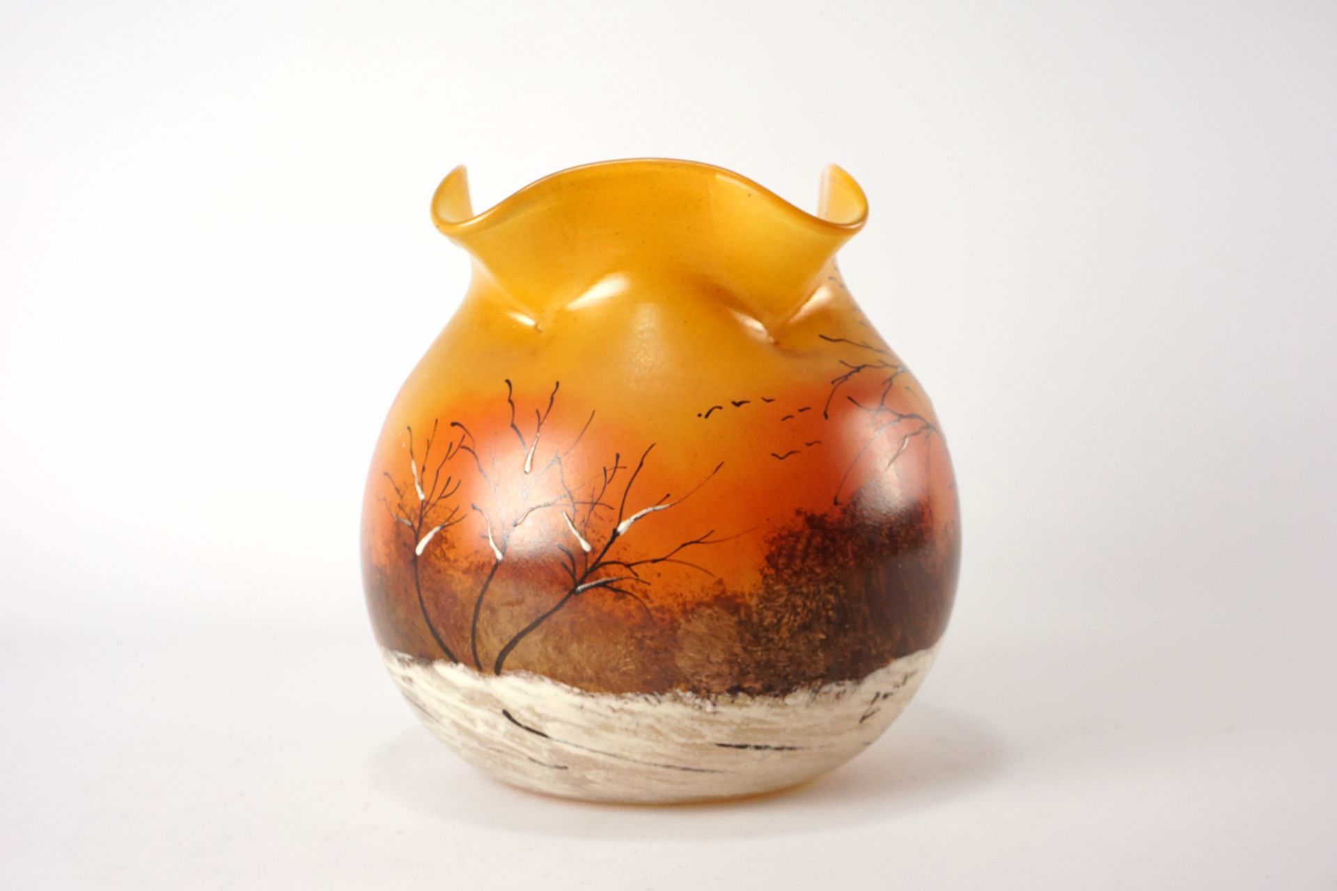 Die Vase stammt aus der Legras Serie mit Winterlandschaften, die es mit diesem und ähnlichen Motiven in verschiedenen Glasformen gab.