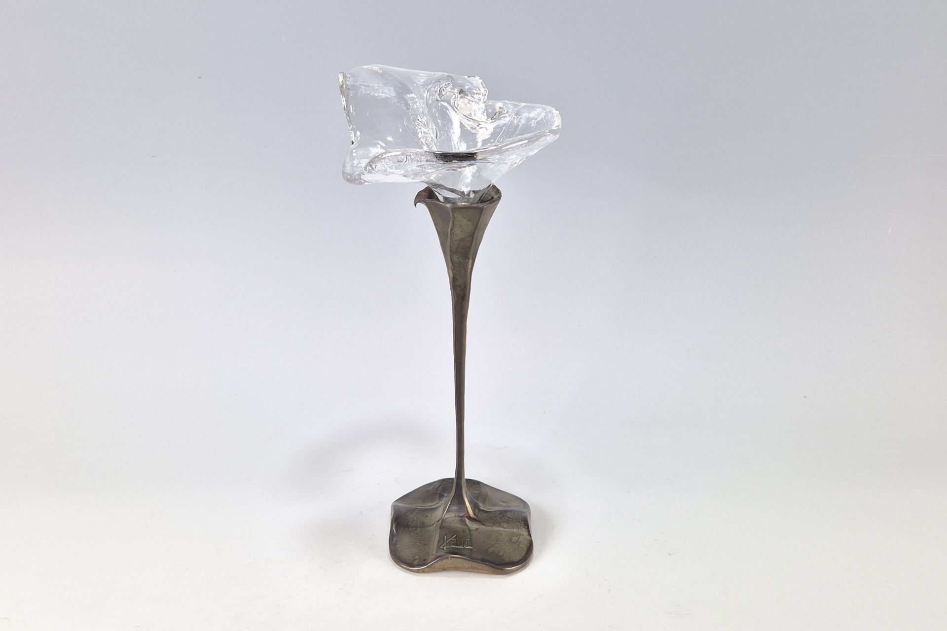 Dieser vom bekannten Künstler Lothar Klute (1946-2023) gefertigte Leuchter , ebenfalls aus Bronze gefertigt weißt eine Besonderheit in Kombination mit handgefertigtem Glas auf.