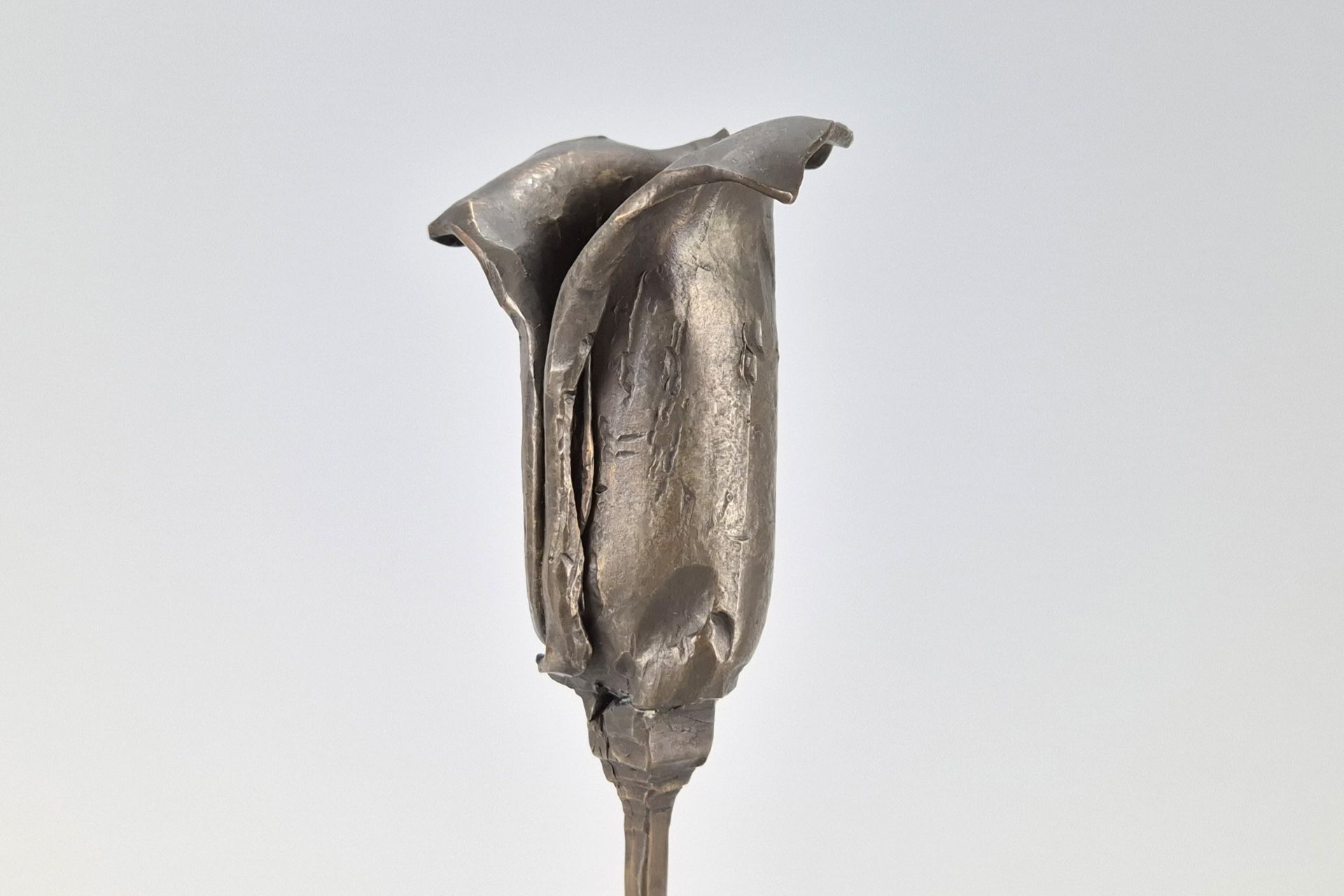 Leuchter Nr 1 ist im brutalistischen Stil in Bronze gefertigt, hat einen runden Fuß, einen quadratischen sich verjüngenden Stil und eine an eine Rose angelehnt öffnende Knospe, in welcher man die Kerze platzieren kann.