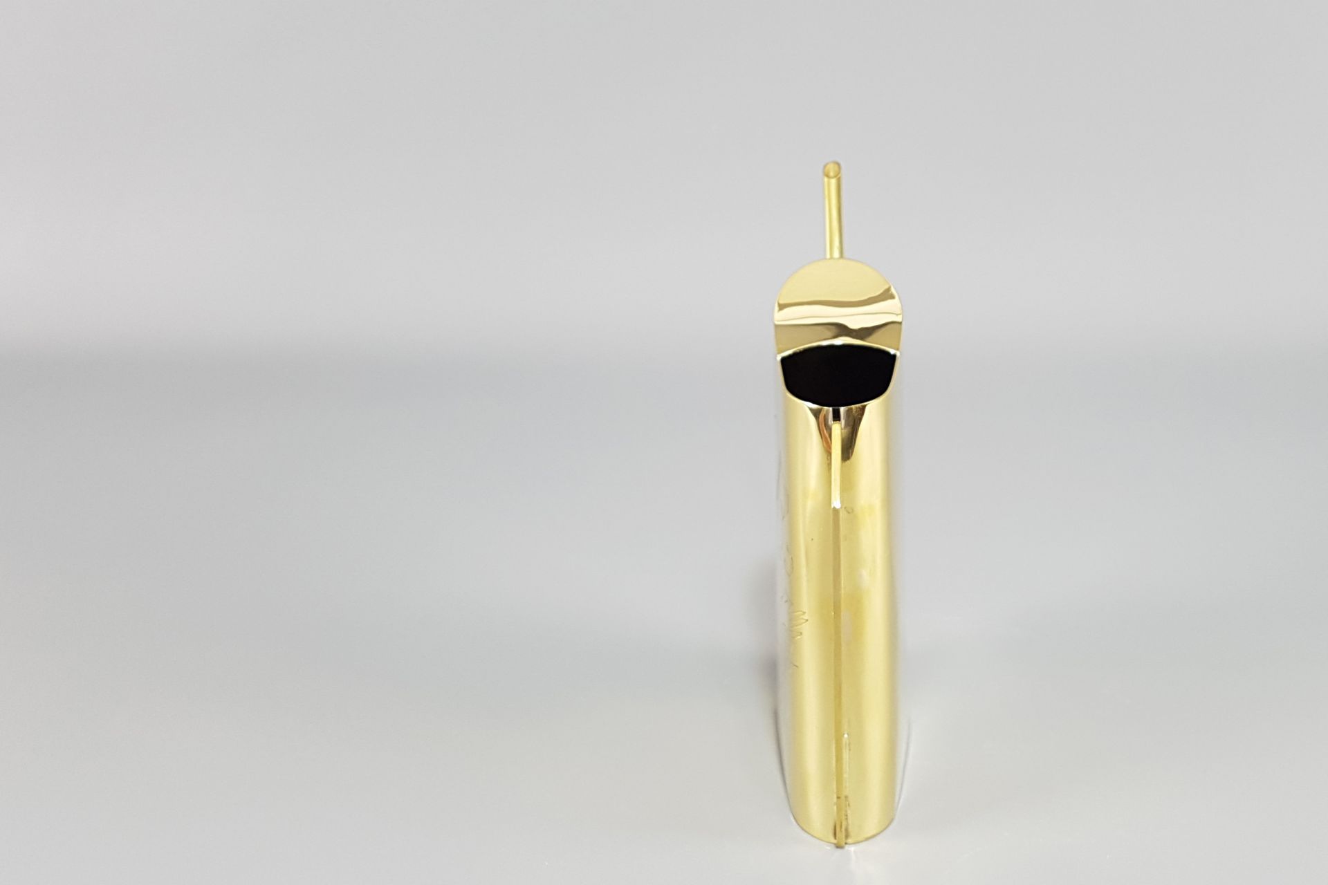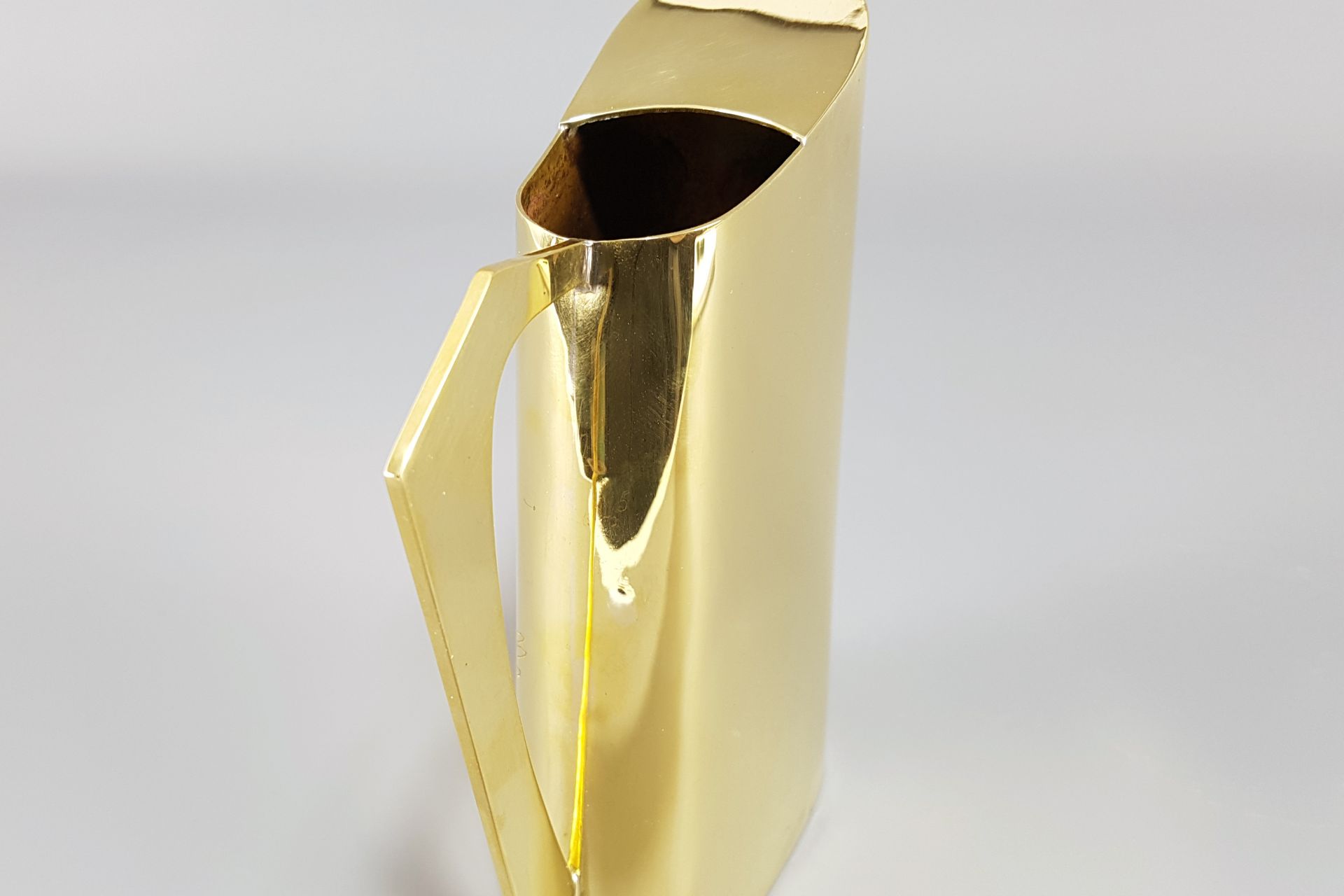 Die Kanne besticht durch ihre sich flach konisch verjüngende, aufs wesentlich reduzierte Formensprache, mit schlichtem Flachgriff und geschwungenen Ausguss. Die Eleganz des Einfachen.