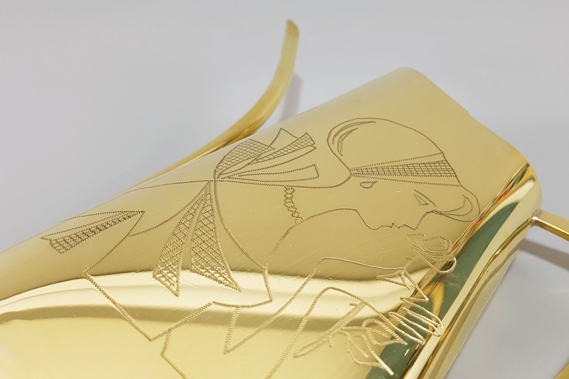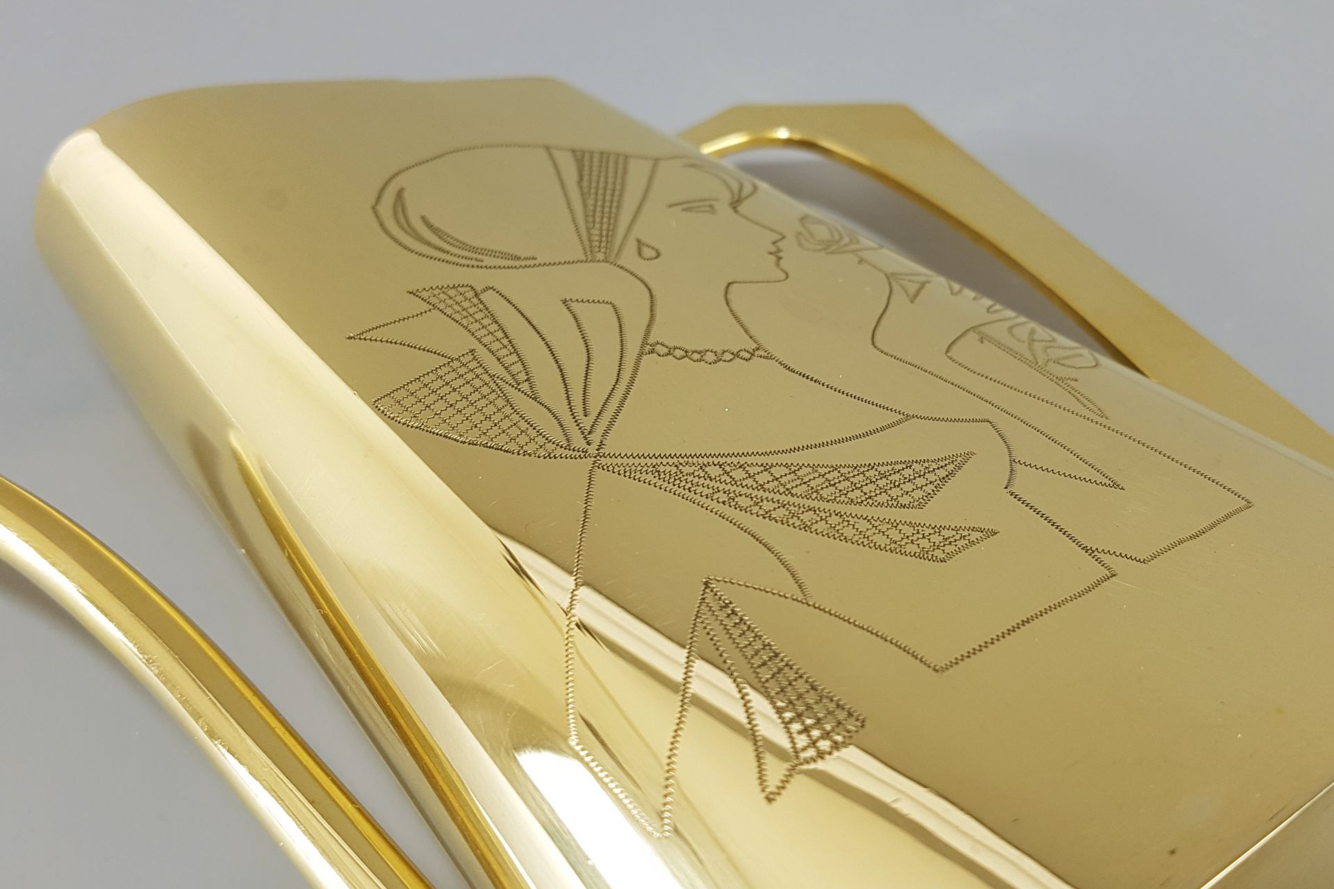 Eine Besonderheit dieser in Handarbeit gefertigen Kanne ist zudem die graziele und sehr schöne Stichelgravur eine jungen Dame mit Sommerkleid, Kopftuch und Rose in der Hand.