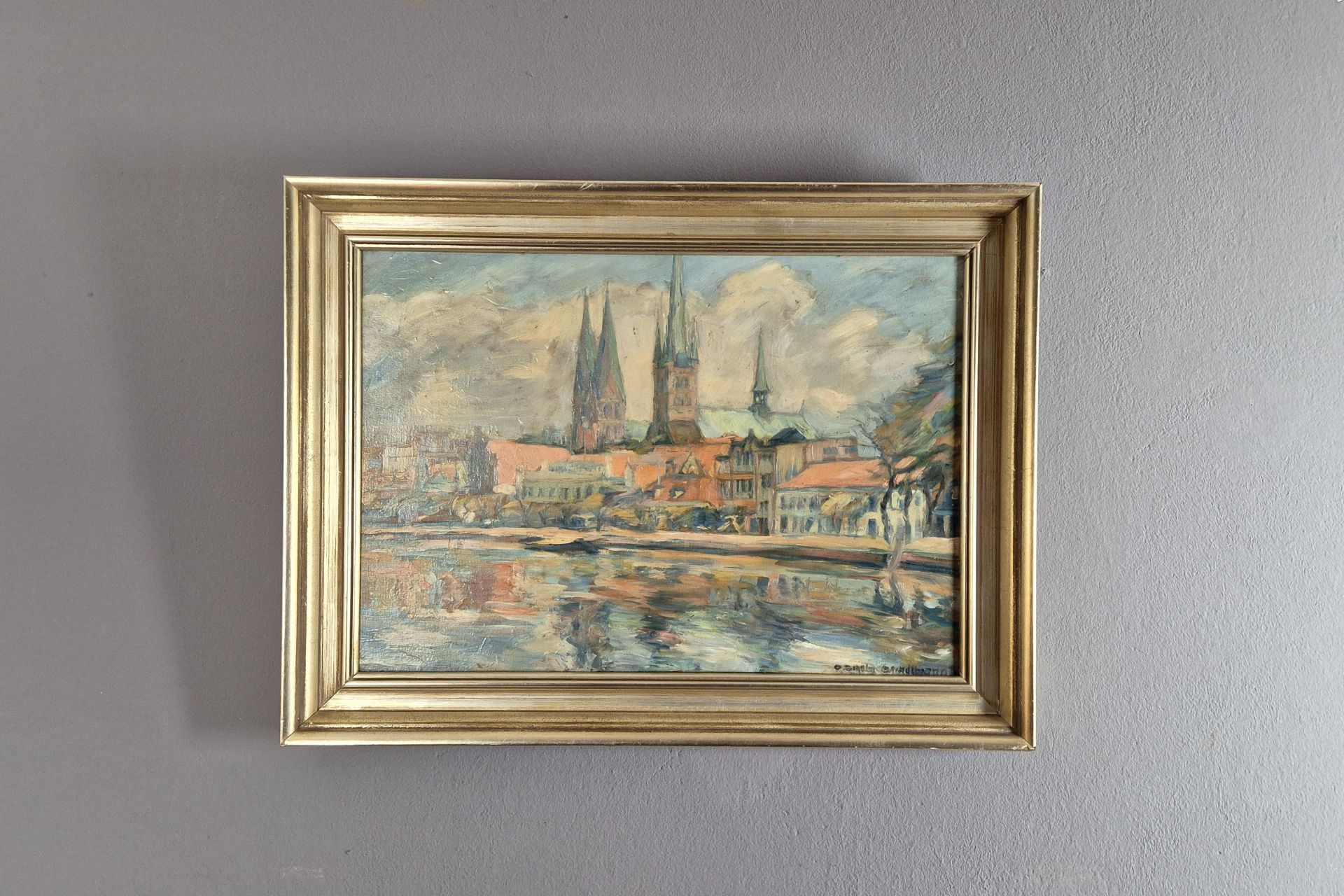 Stimmungsvolles impressionistisches Gemälde der 1920er/30er Jahre mit Blick über die Trave auf die Lübecker Altstadt.