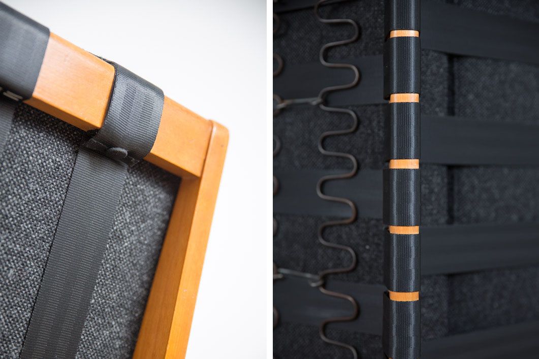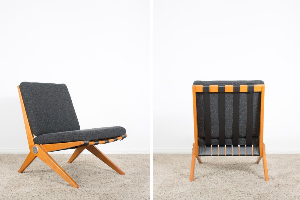 Wunderschöner Scissor Chair von Pierre Jeanneret für Knoll International. Der armlose Sessel wurde mit passenden Materialien hochwertig restauriert. Neue Gurtung, neue Schaumstoffe, Hallingdal 180 Bezug von Kvadrat -Dänemark.