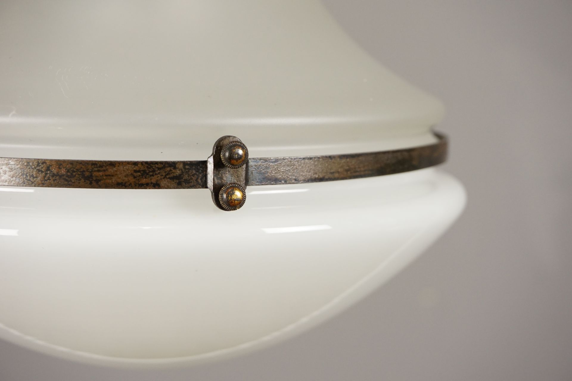 Sowohl Oberteil und Unterteil, welche mit einem Metallring verbunden sind gab es jeweils satiniert, wie auch aus weißem Opalglas. Die hier nun angebotene Luzette ist ein Traum an Originalität.