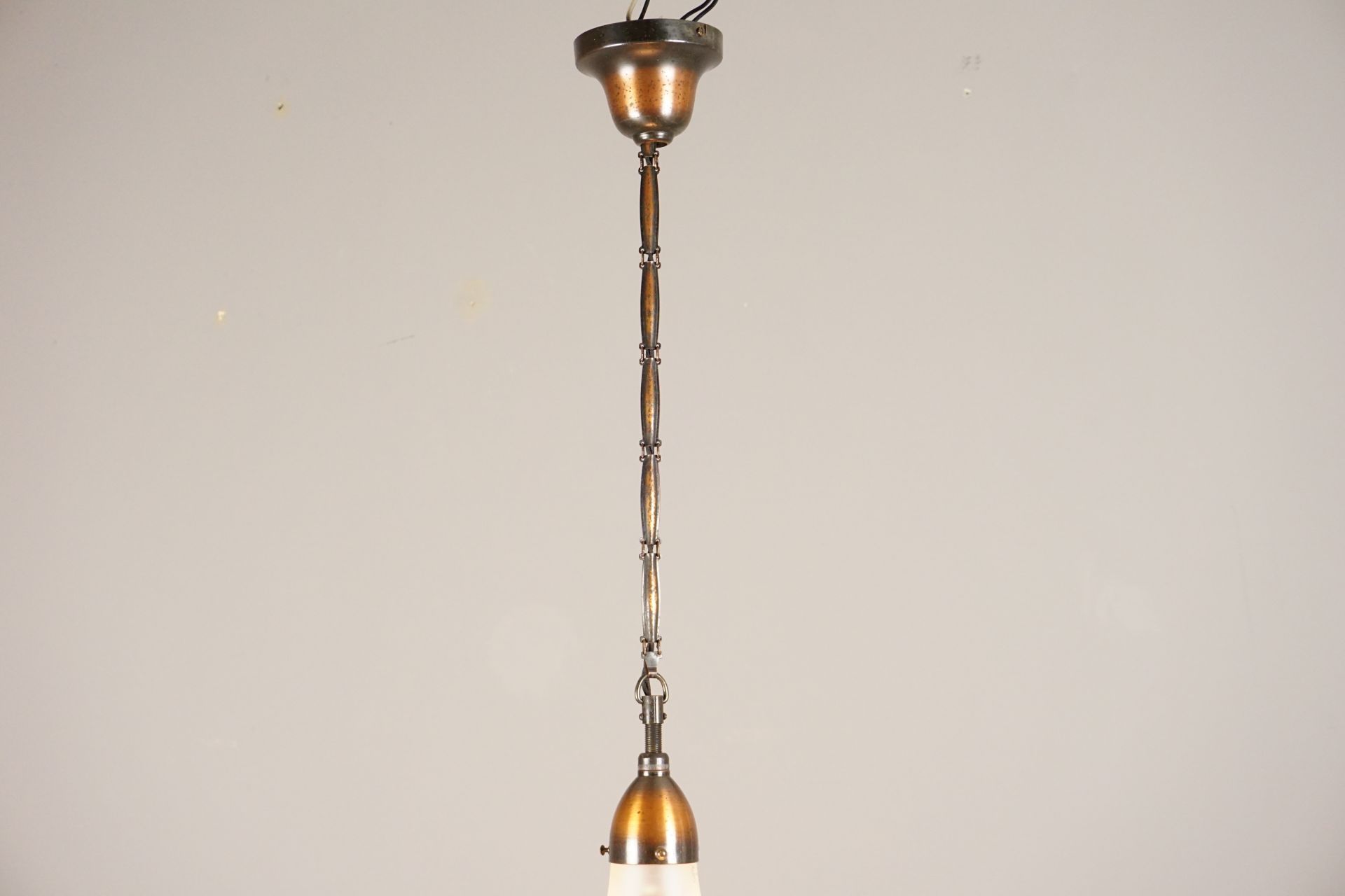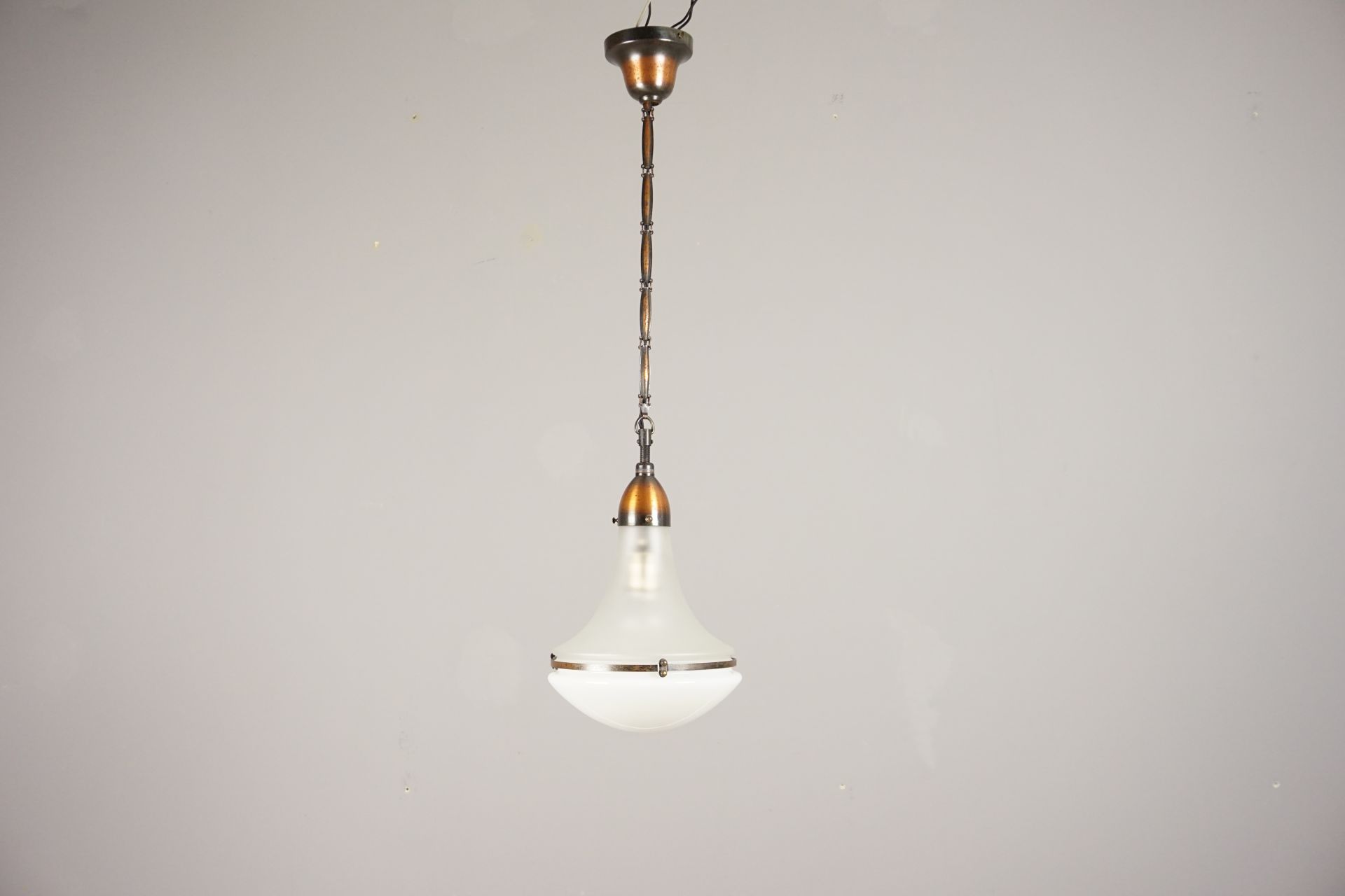 Sie wurde komplett zerlegt, gereinigt und die Metallteile lediglich gewachst, um die schöne Patina zu bewahren und konservieren. Auch sind alle Anbauteile original - keine verbauten Reproglasschirme, falsche Ketten, Dome oder dergleichen.