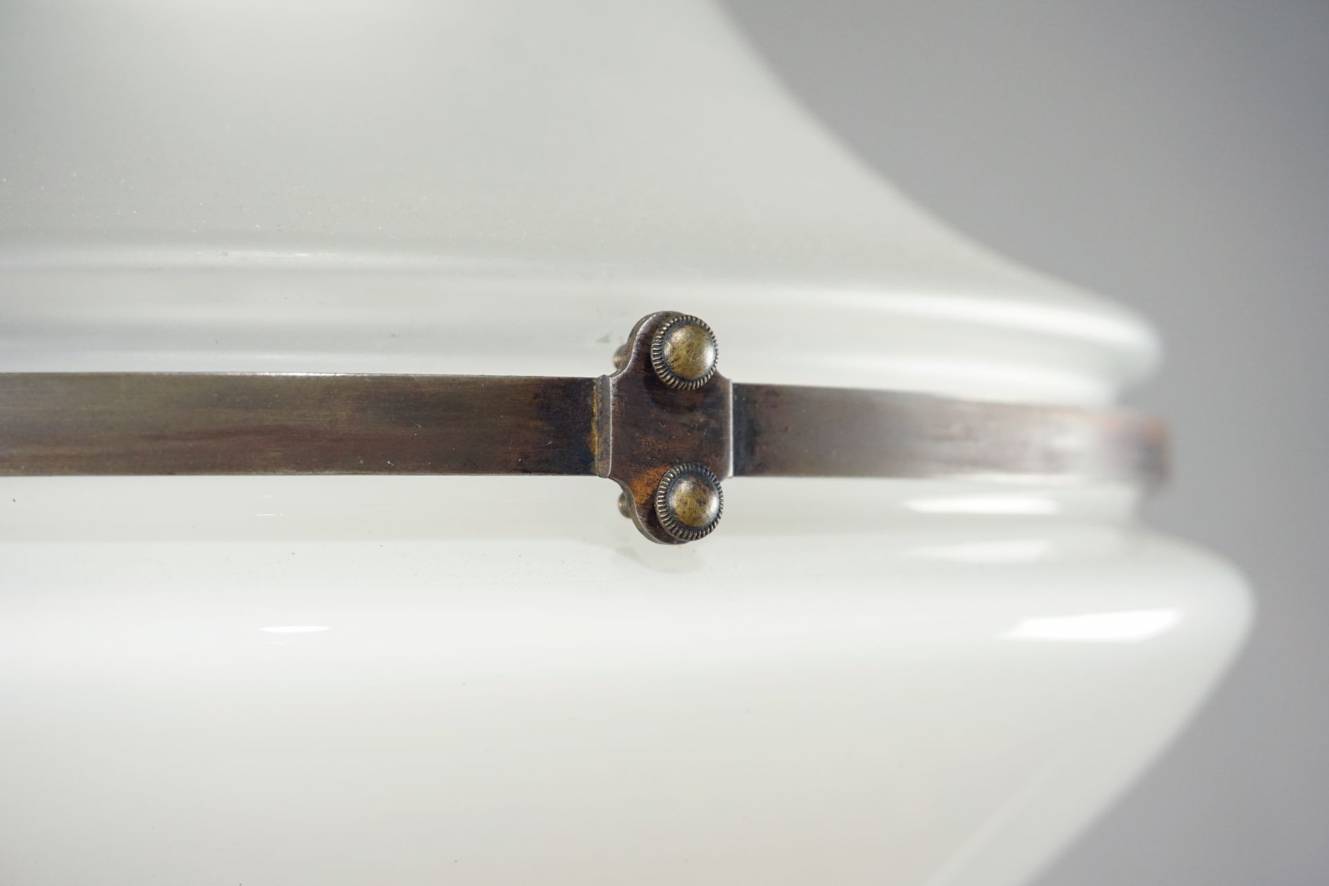 Sowohl Oberteil und Unterteil, welche mit einem Metallring verbunden sind gab es jeweils satiniert, wie auch aus weißem Opalglas. Die hier nun angebotene Luzette ist ein Leuchtentraum in der größten Version mit 32 cm Durchmesser.