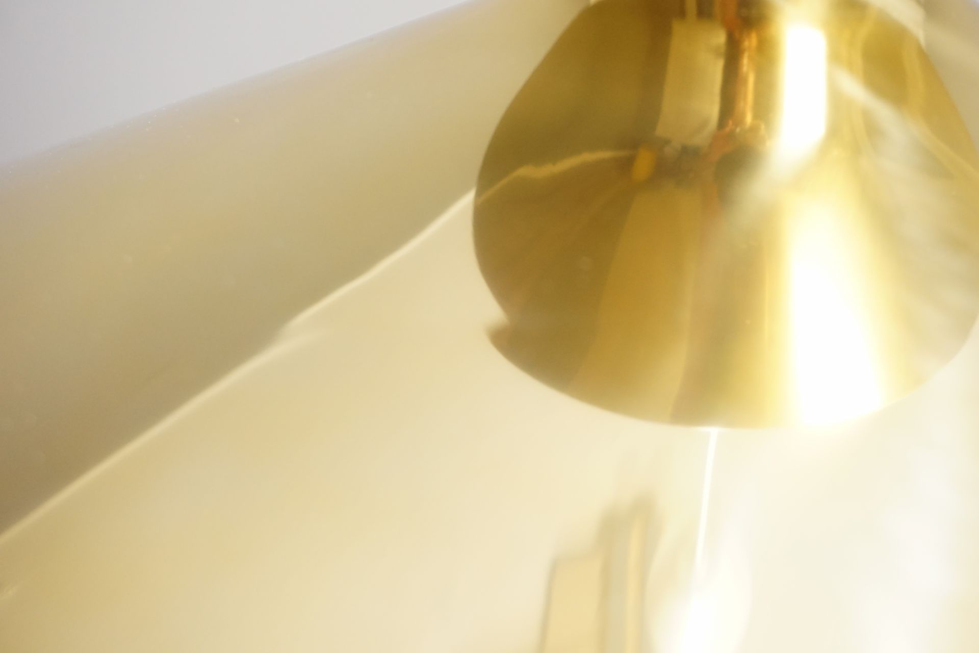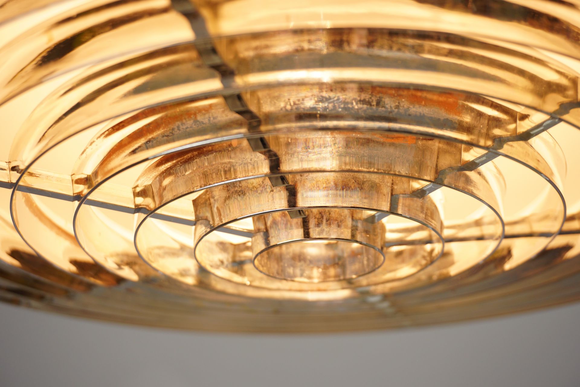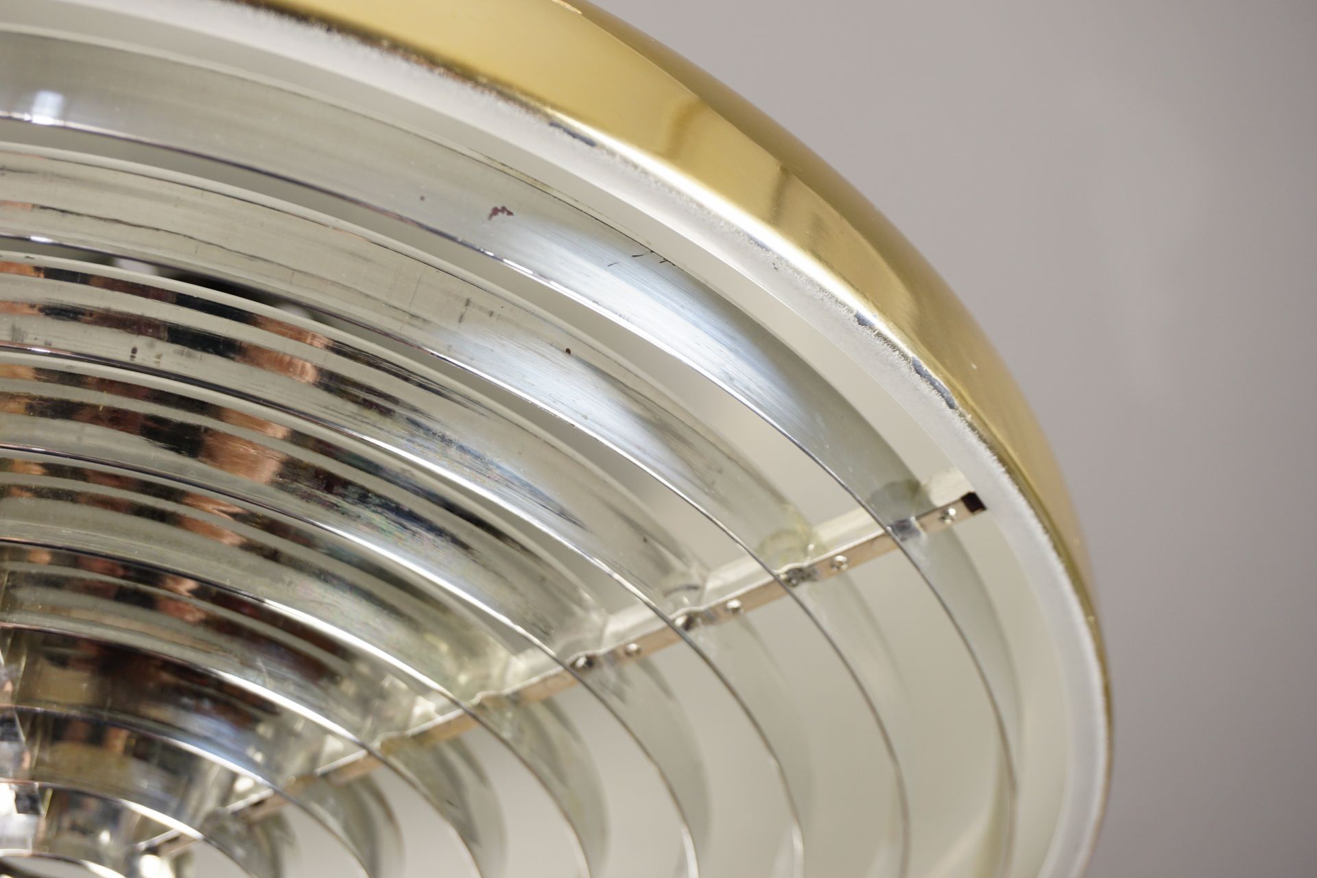 Schlicht-elegante -zeitlose Formgebung mit einem zweigeteiltem Schirm aus gold beschichtetem/exloxiertem Aluminium und einem Blendringeinsatz aus verchromten Kunststoff.