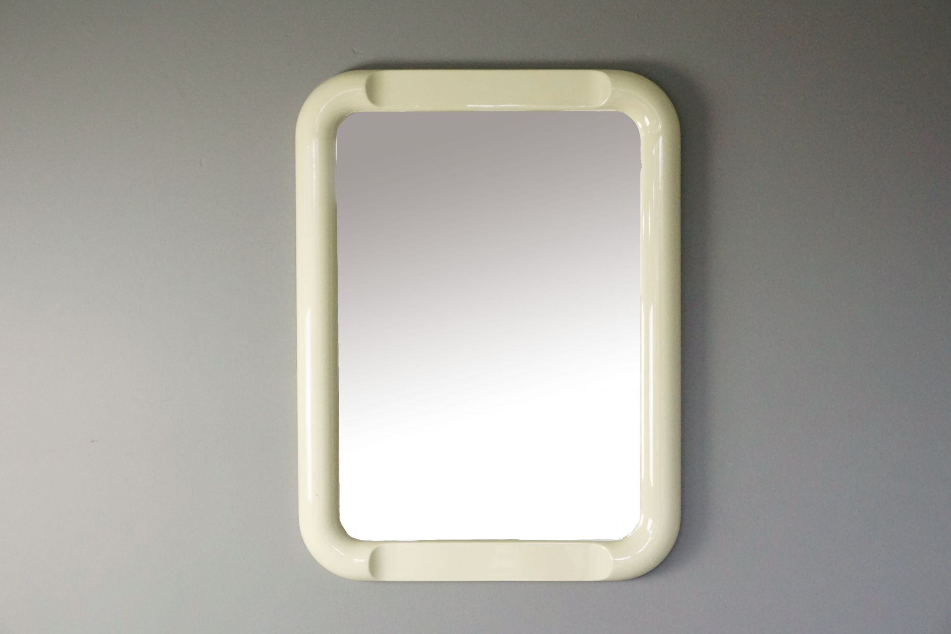Der Spiegel besticht durch seine wunderbare Größe, der abgerundeten Formgebung im Umriss wie auch in der halbkreisförmigen Profilkontur.