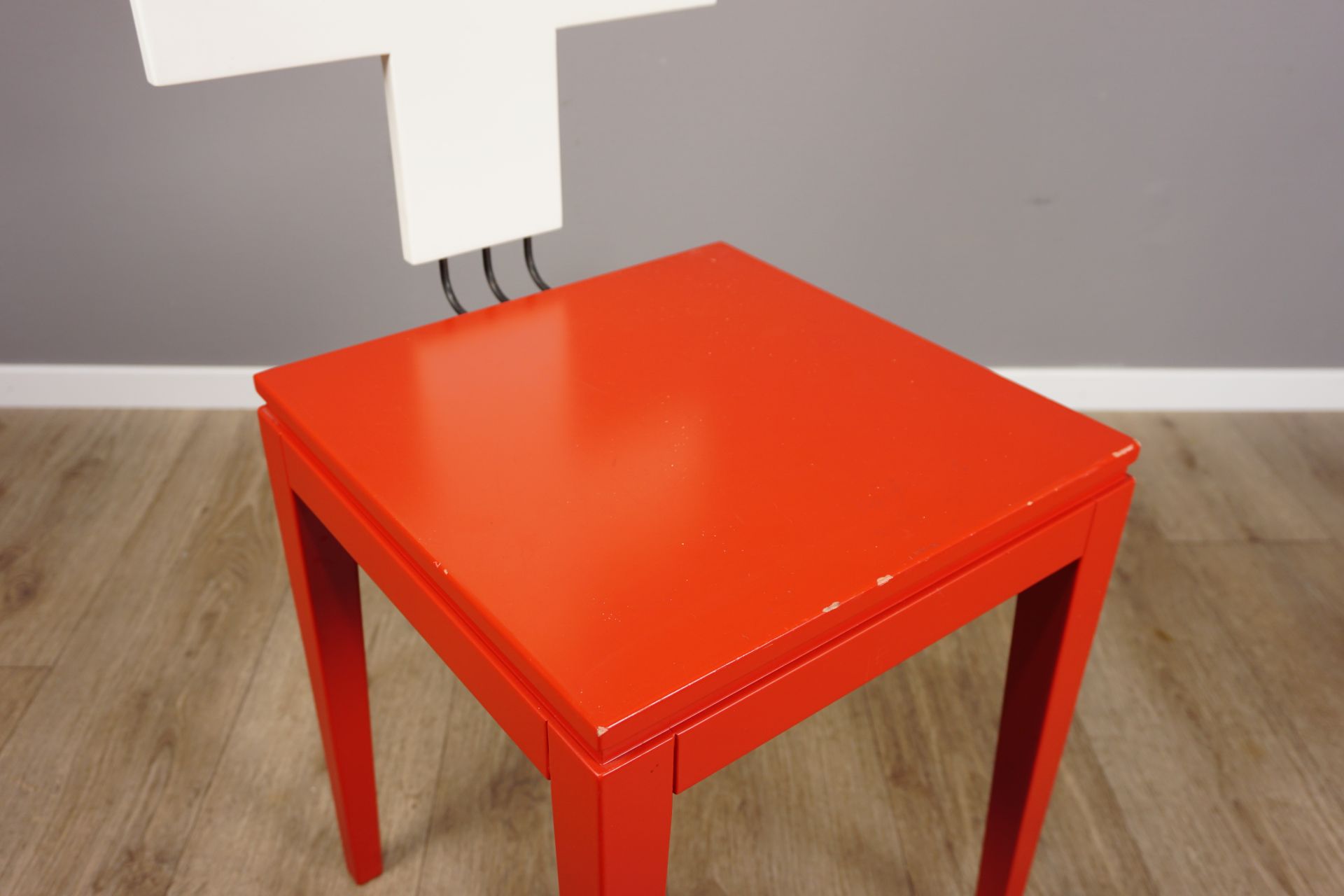 Sehr schöner und aussergewöhnlicher Stuhl, der 1991 in limitierter Ausführung zum 700.Geburtstag der Schweiz gefertigt wurde. Der Stuhl nimmt dabei Bezug auf die schweizer Nationalfahne, welche ein weißes Kreuz auf rotem quadratischen Grund zeigt. Diese quadratische Grundfläche findet sich auch bei der Sitzfläche wieder. Durch die dünnen schwarzen Streben wirkt das Kreuz optisch fast schwebend.