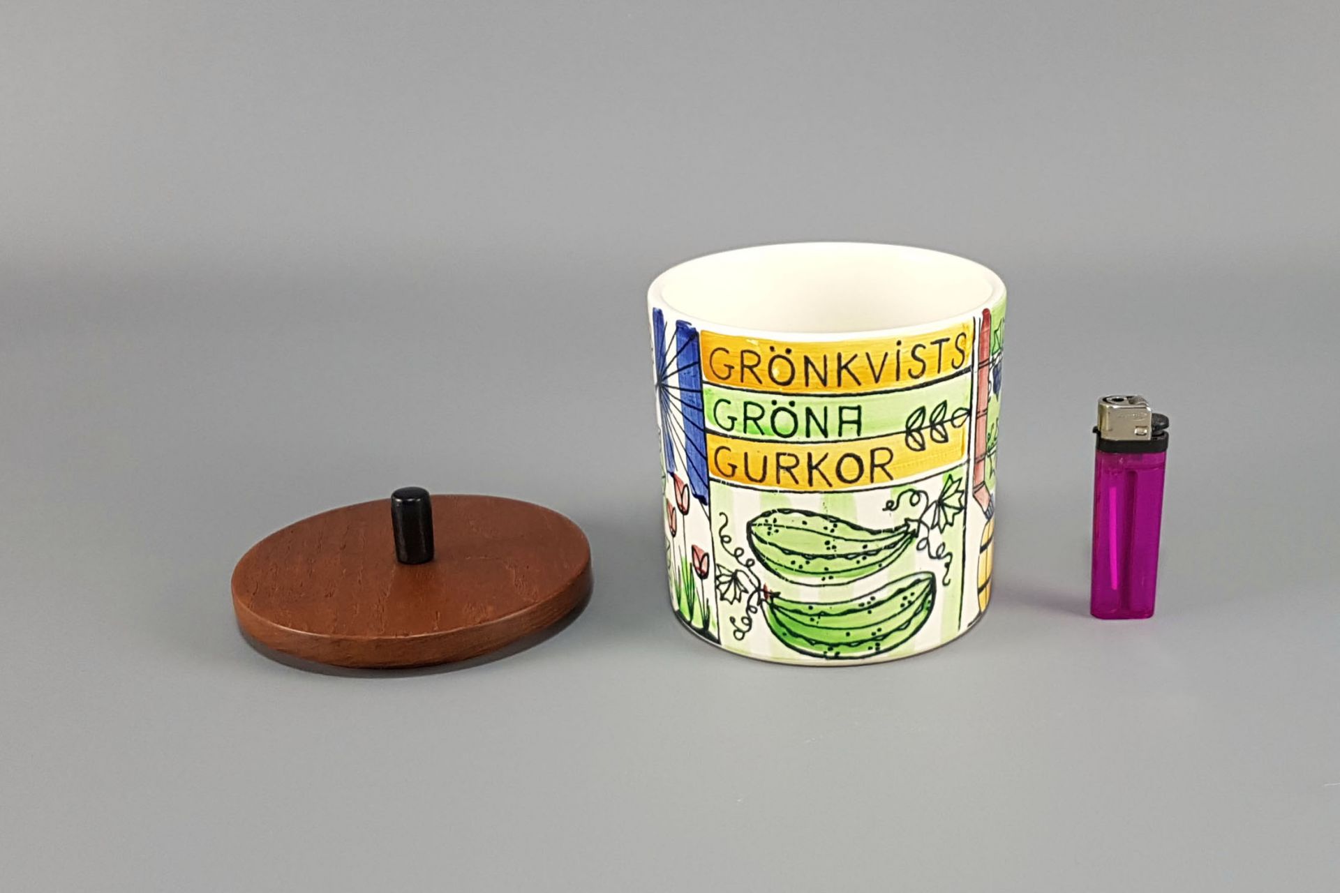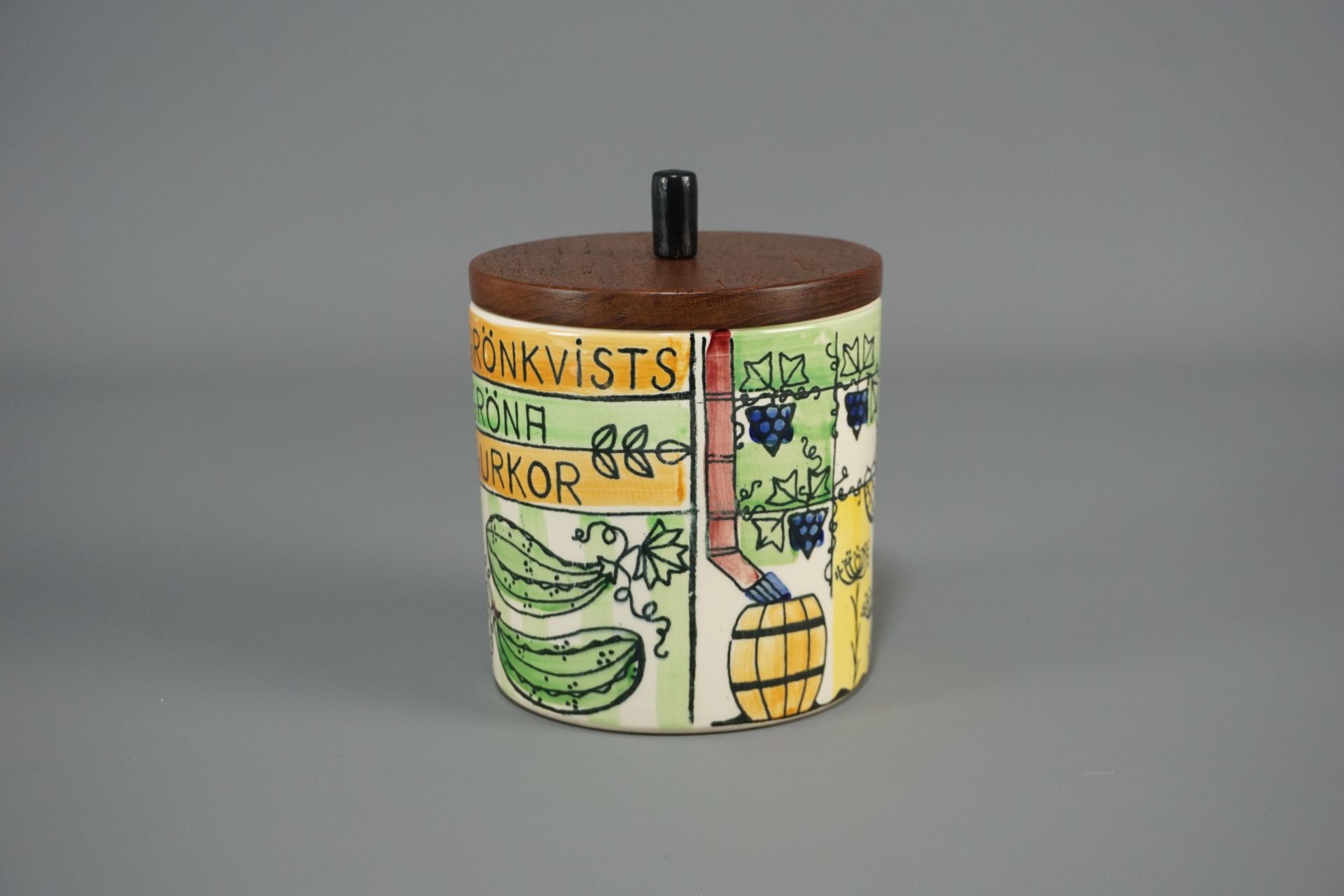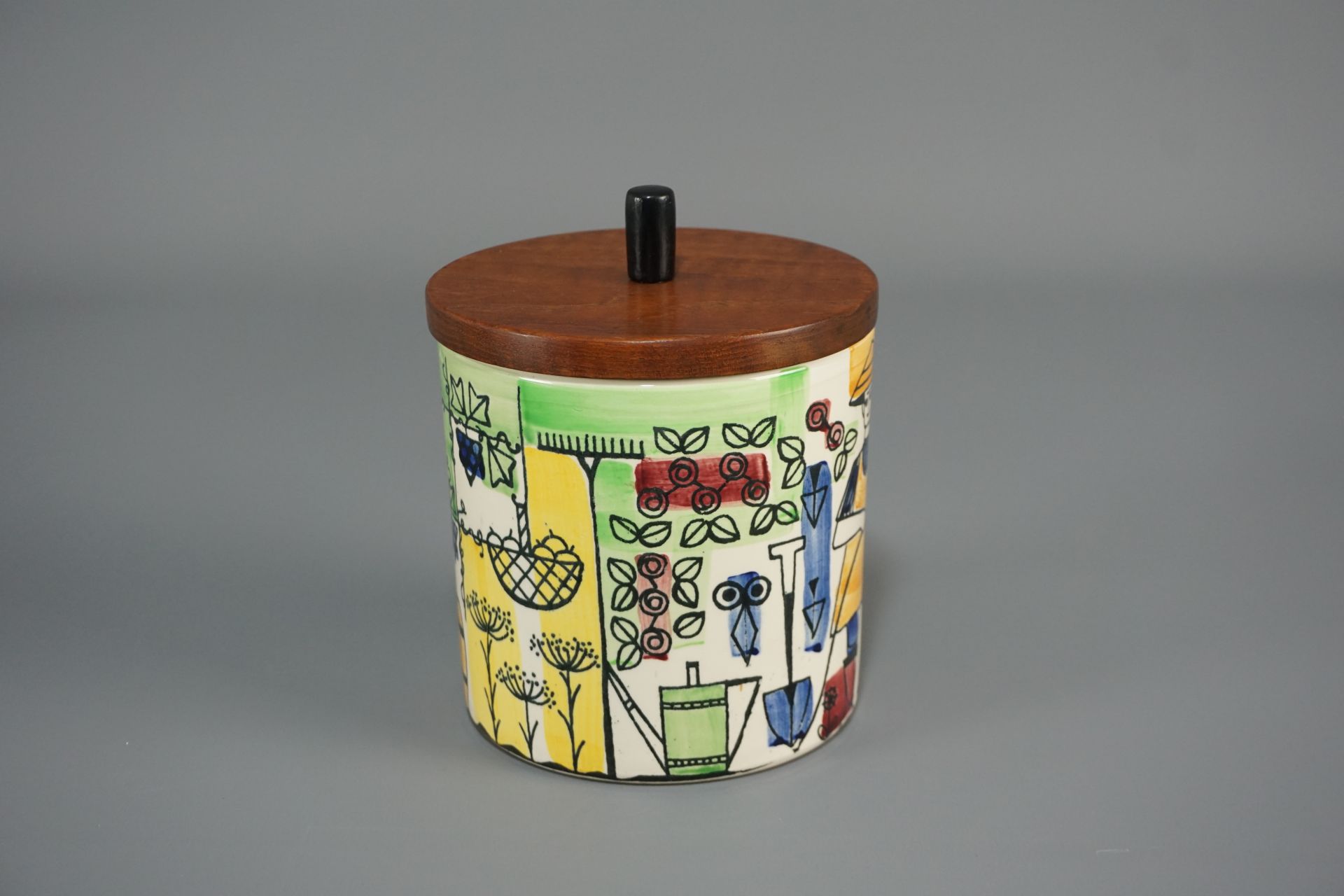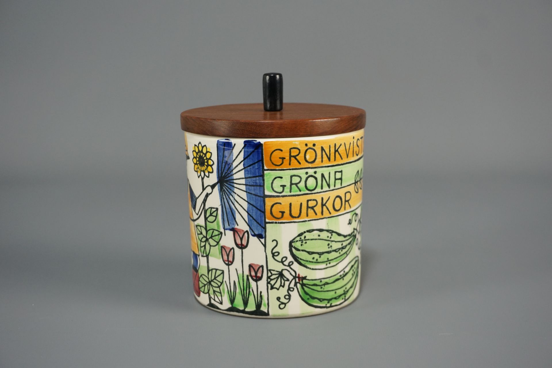 Sehr schöne zylindrische Keramikdose mit Teakholzdeckel der Künstlerin Anita Nylund.
