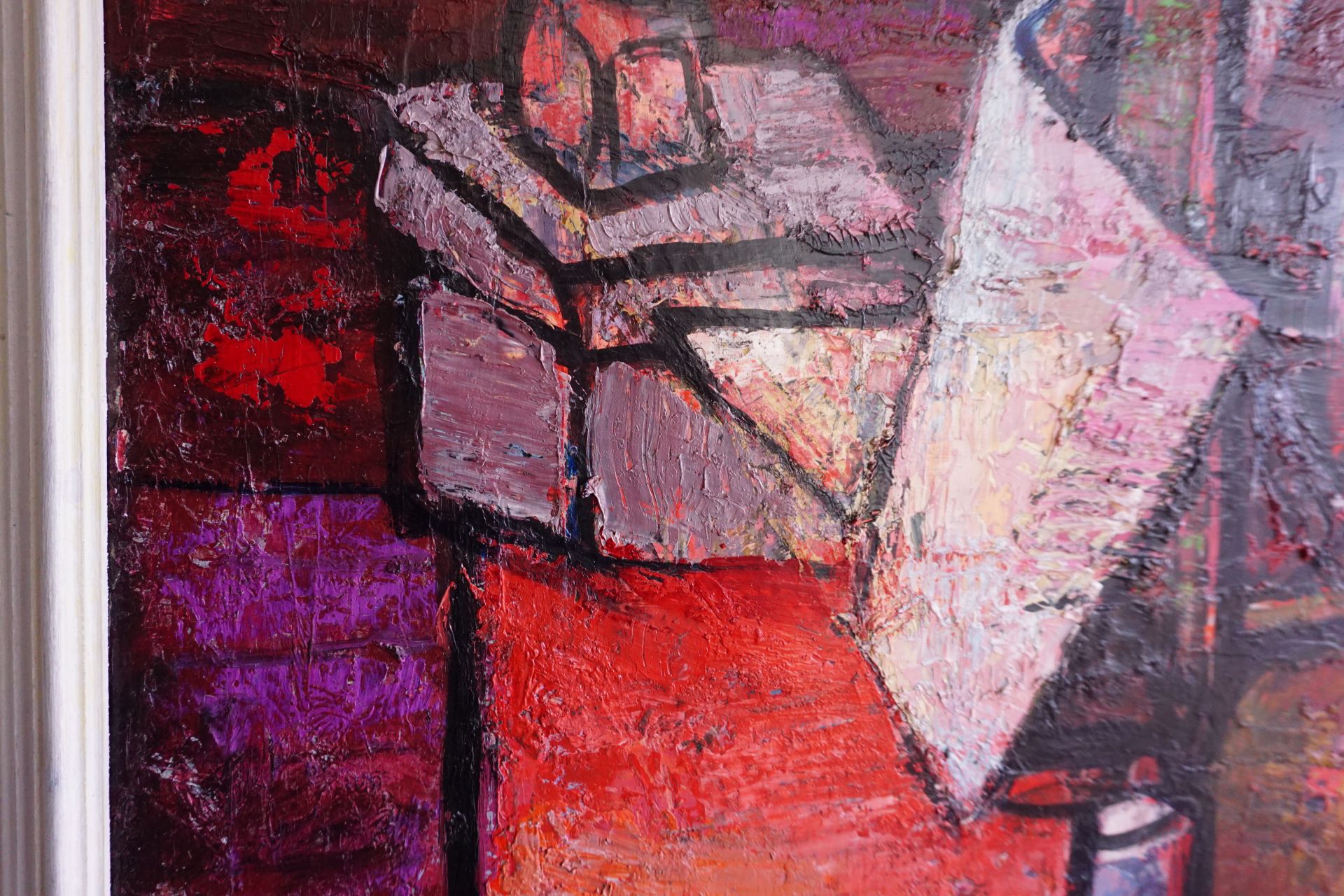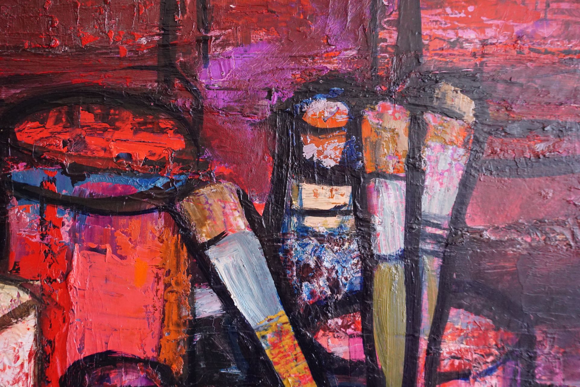 Rötliche Farbtöne dominieren das Bild, welches zudem mit einem kräftigen Impasto in Mal und Spachteltechnik erstellt wurde.